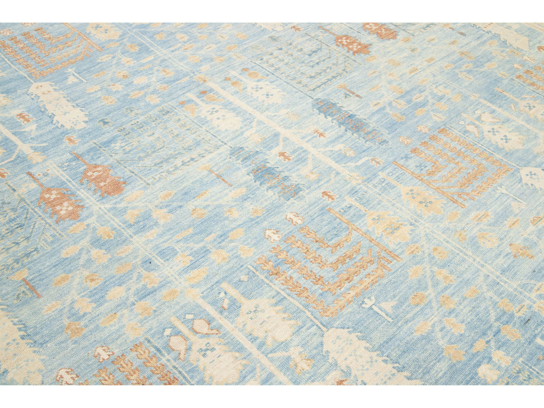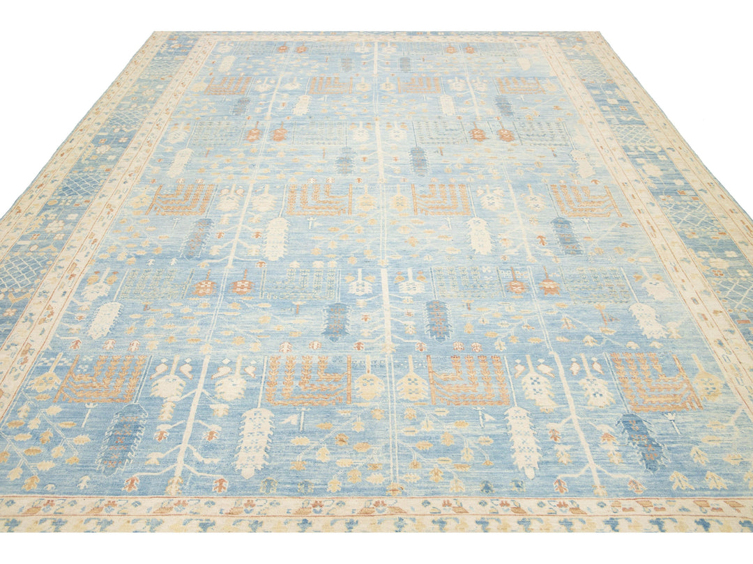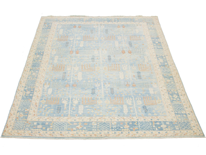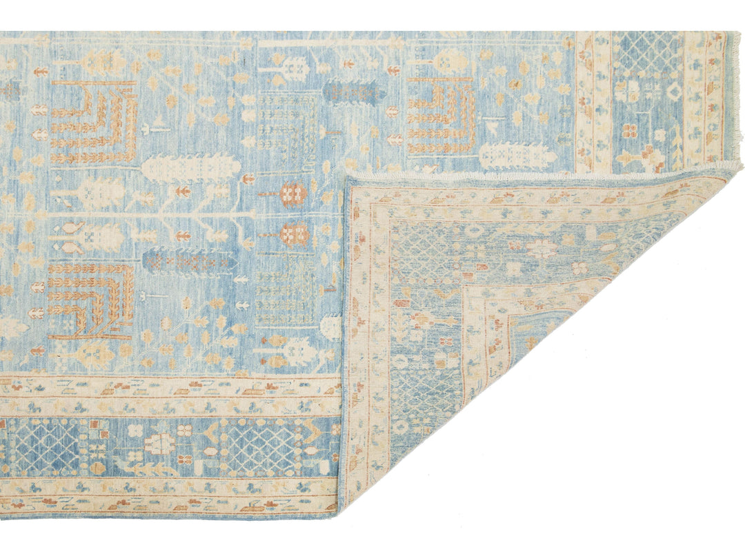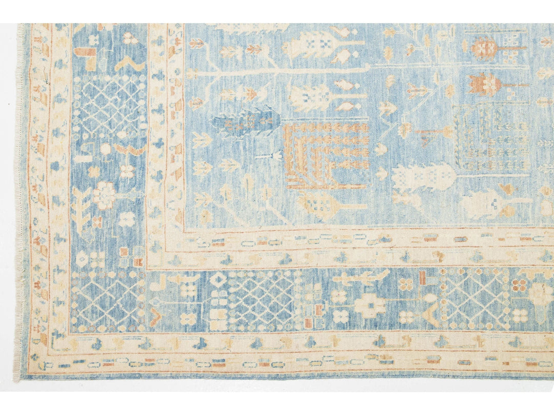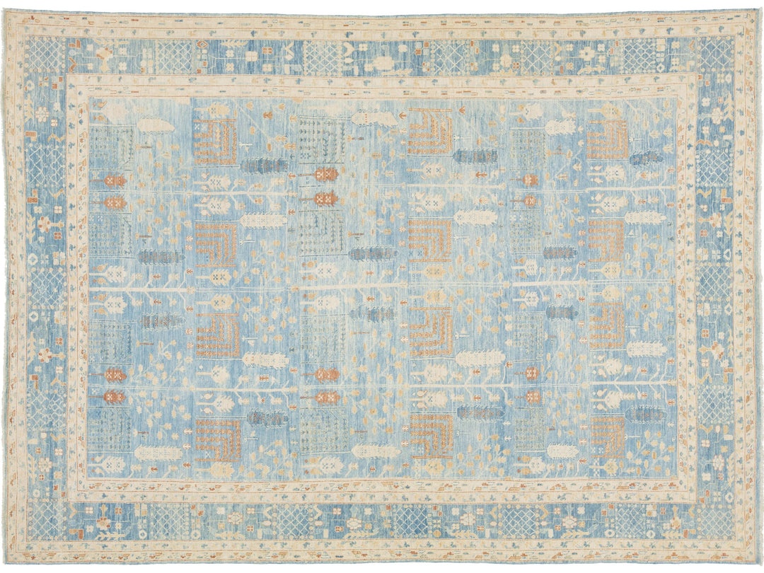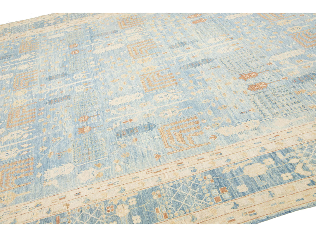 This exquisite modern Khotan hand-knotted wool rug features a calming light blue field, bordered by a detailed design highlighted with sophisticated beige and rust tones.