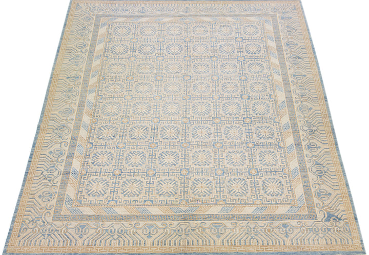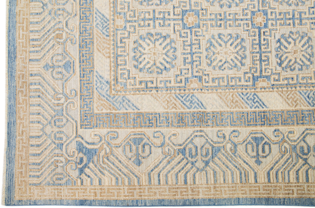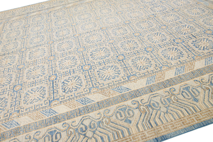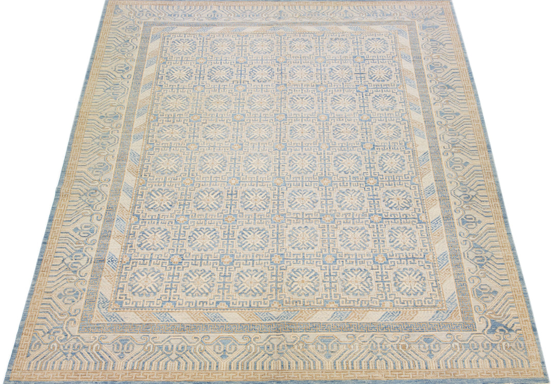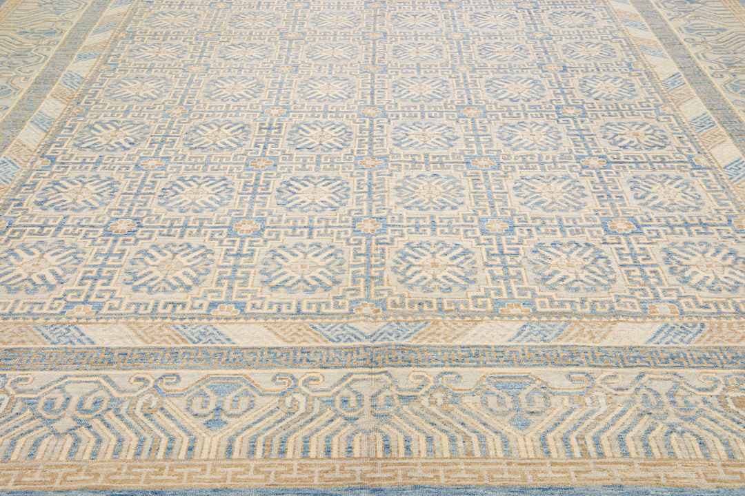 Beautiful modern Khotan tone-on-tone hand-knotted wool rug with a beige color field. This piece has blue and brown accents all over a gorgeous interconnected medallion rosette design.