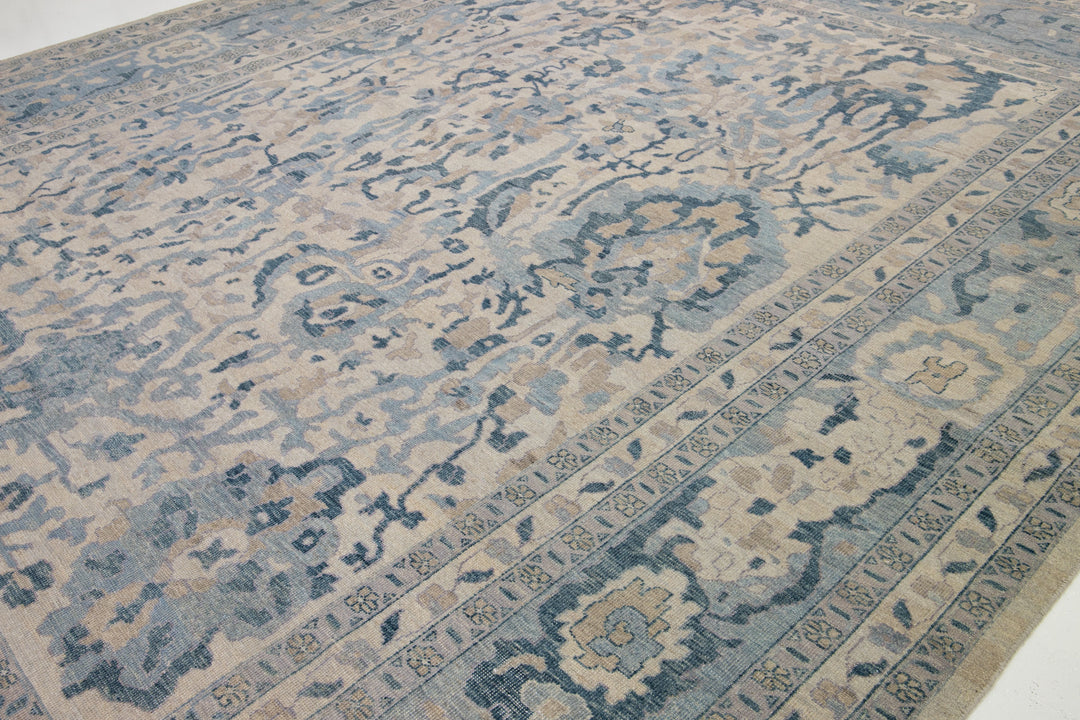 Our modern Khotan wool rug is hand-knotted with a beige color field featuring allover floral designs and blue accents that enhance its aesthetic. Measuring 11'11" x 15', this beautiful, traditional rug is sure to inject style into any room.