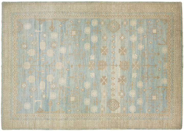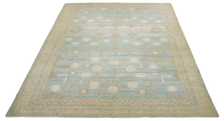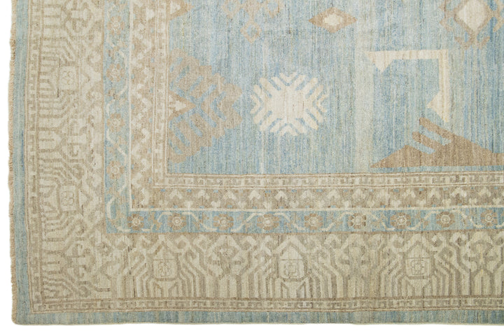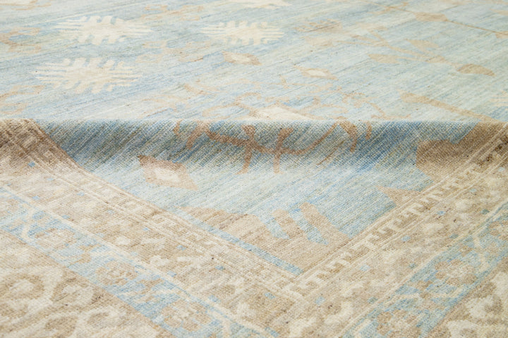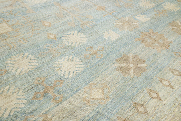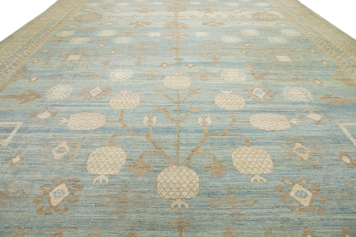 This is an oversized contemporary Khotan wool rug from India. The design showcases a light blue base with intricate brown and cream-colored patterns, including an eye-catching interconnected pomegranate rosette design. This rug measures 16'3" x 22'10".