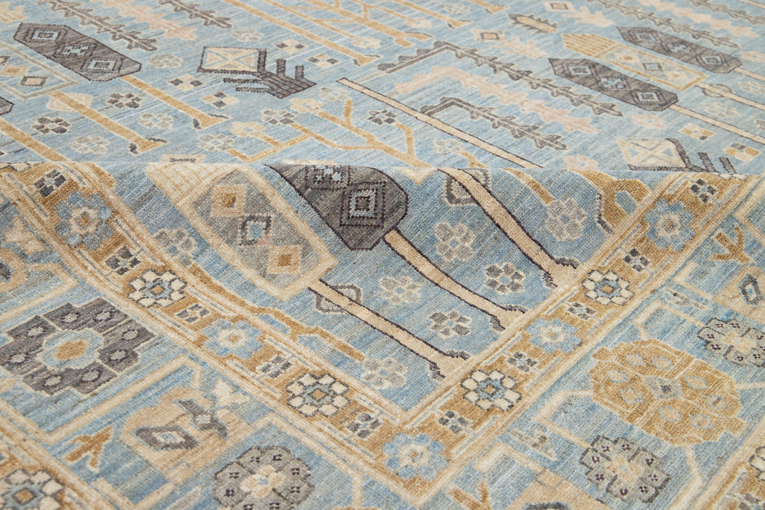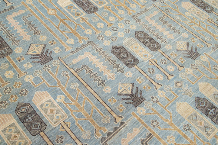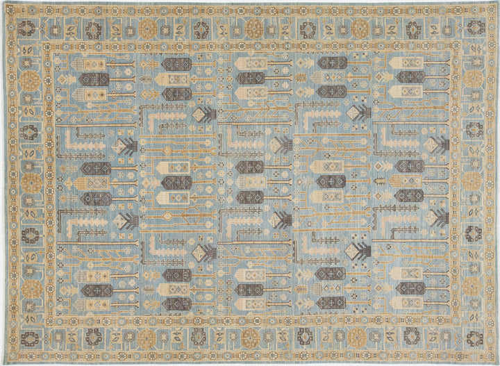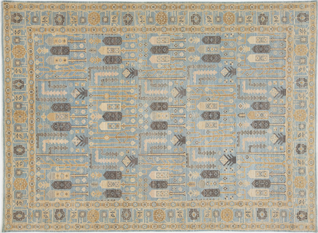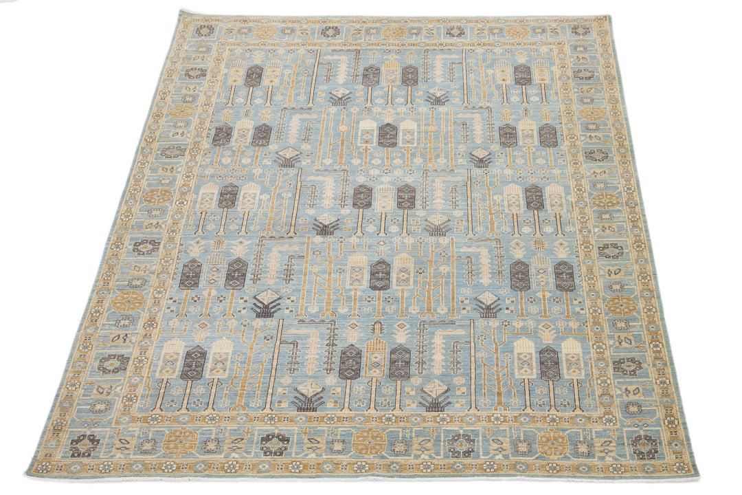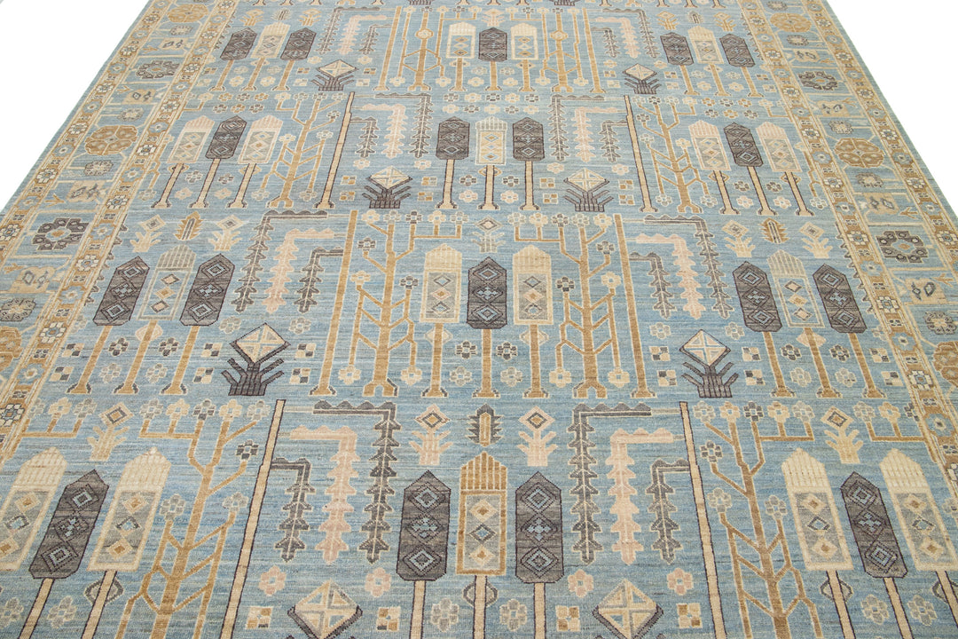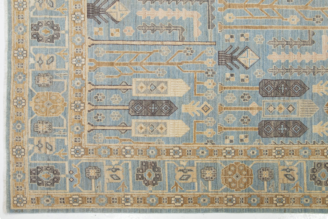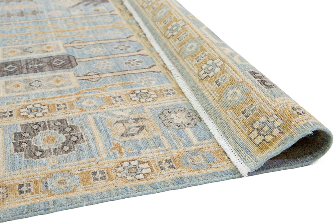 This beautiful modern Khotan hand-knotted wool rug has a light blue field. Its gorgeous design features gray and tan accents. This rug measures 8'10'' X 12'1''.