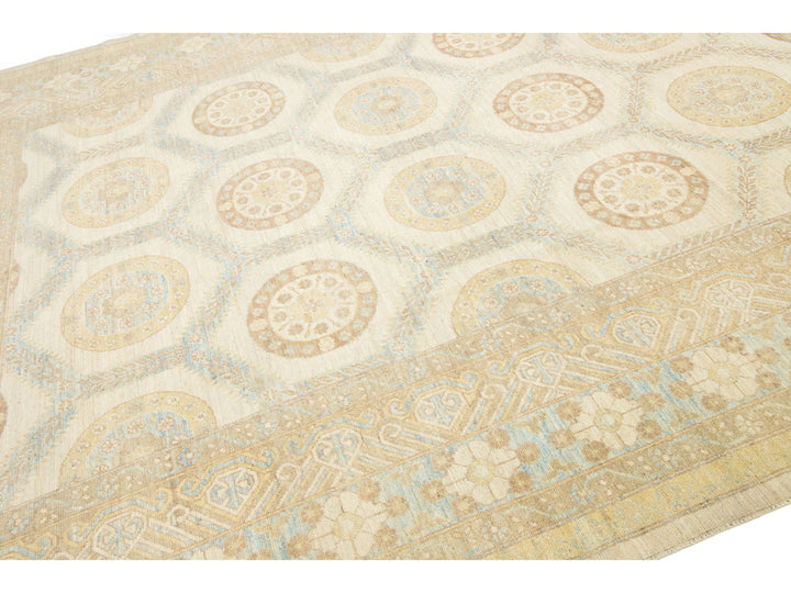 This is a beautiful modern Khotan hand-knotted wool rug with a beige field. Its gorgeous design features light blue and tan accents. This rug measures 9'5'' X 11'10''.