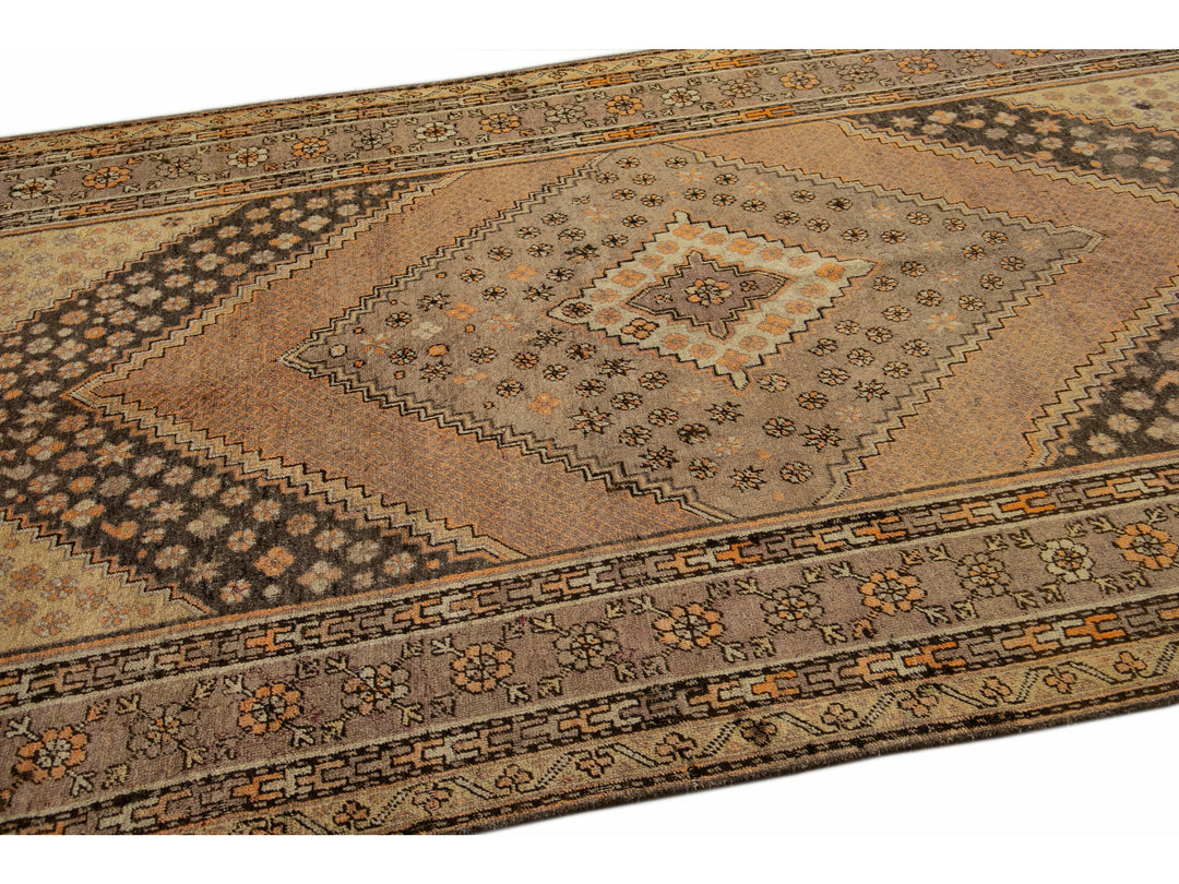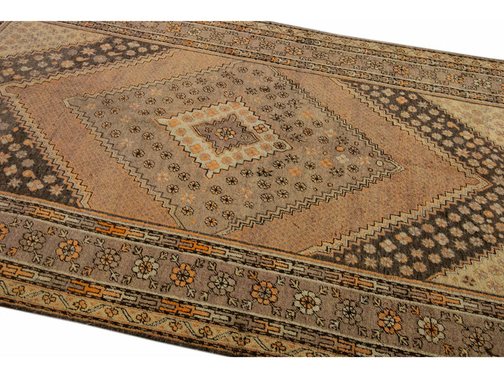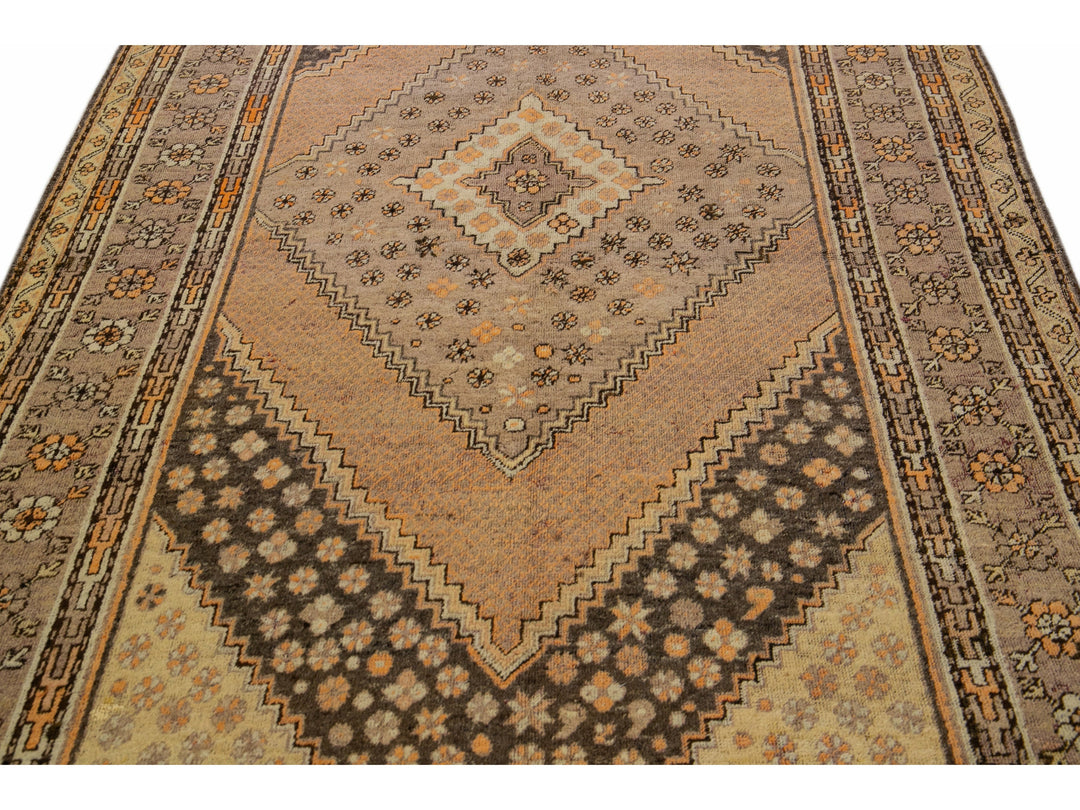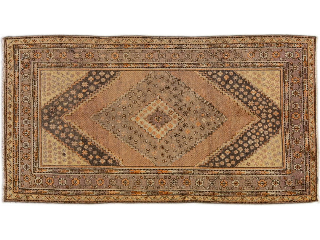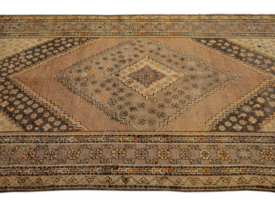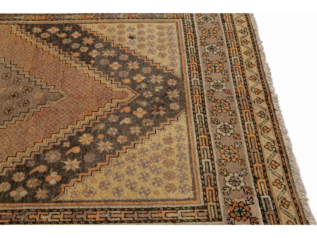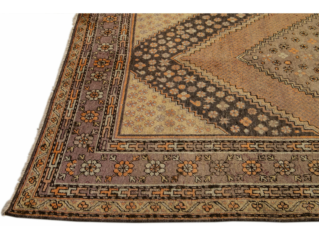 Beautiful antique Khotan hand-knotted wool rug with a tan field. This Khotan rug has a brown and orange accent in an all-over medallion floral design.