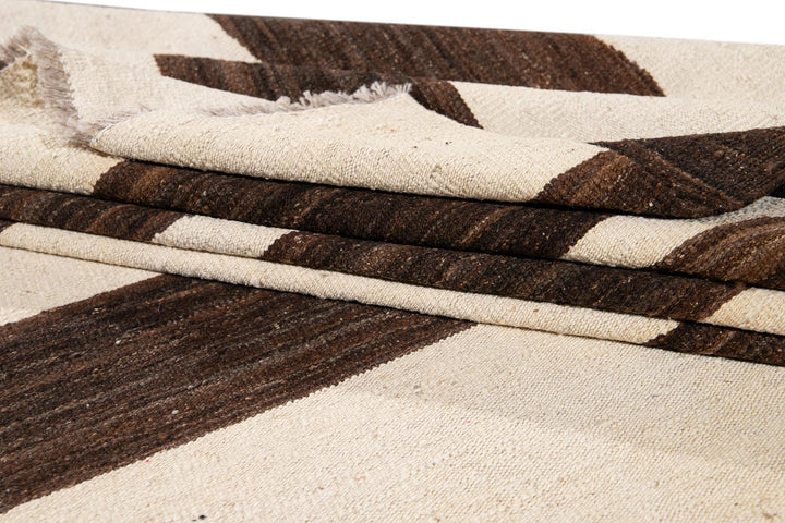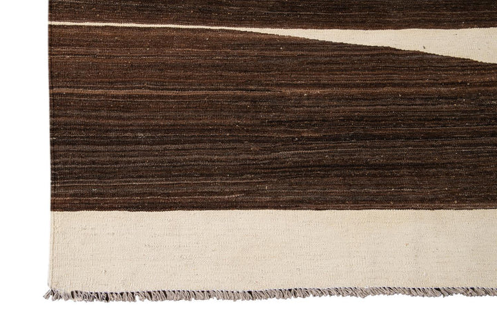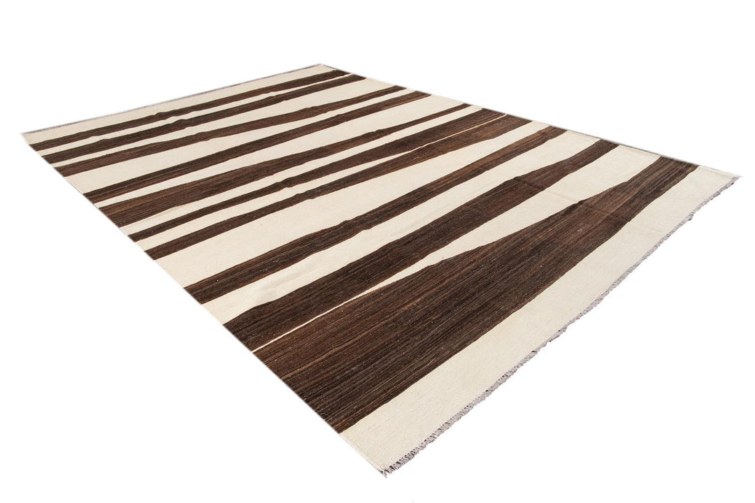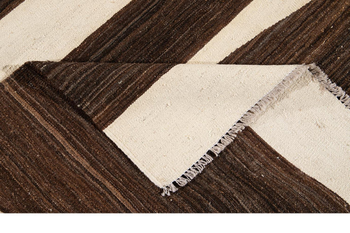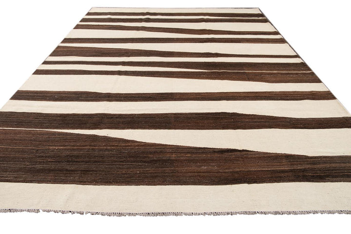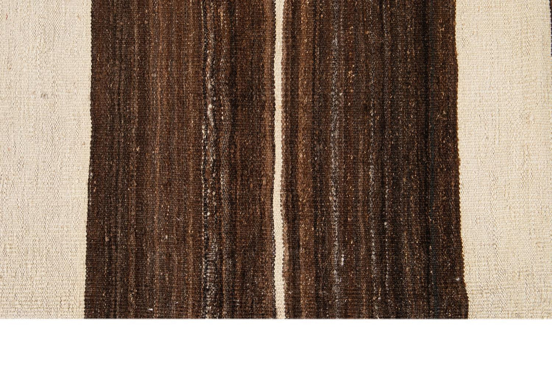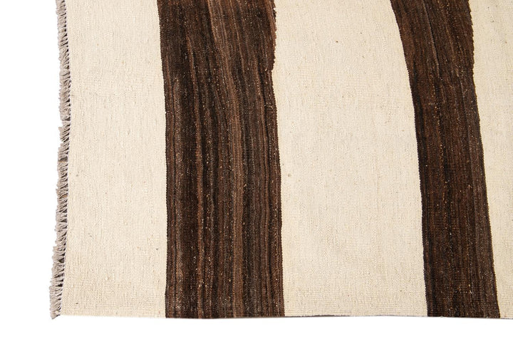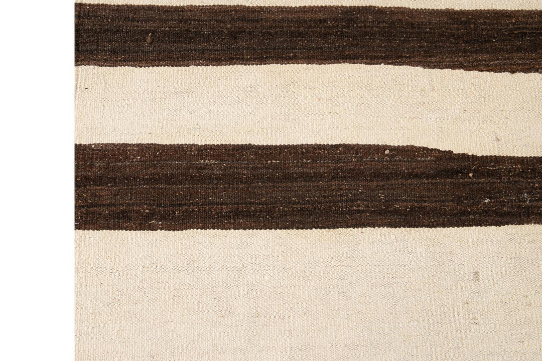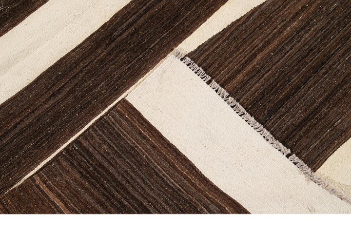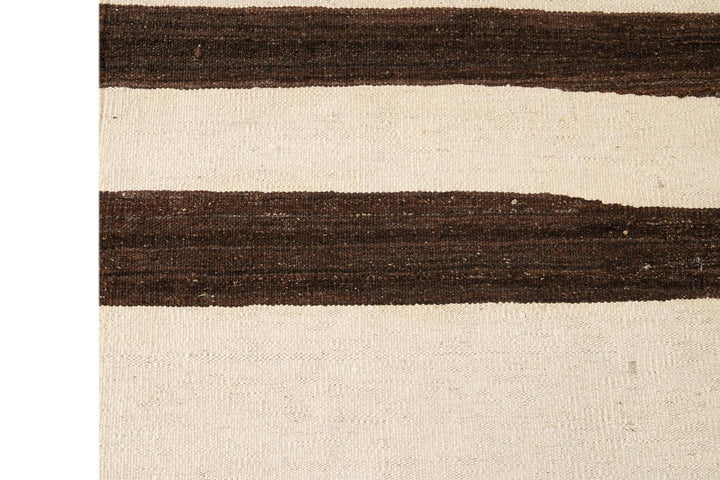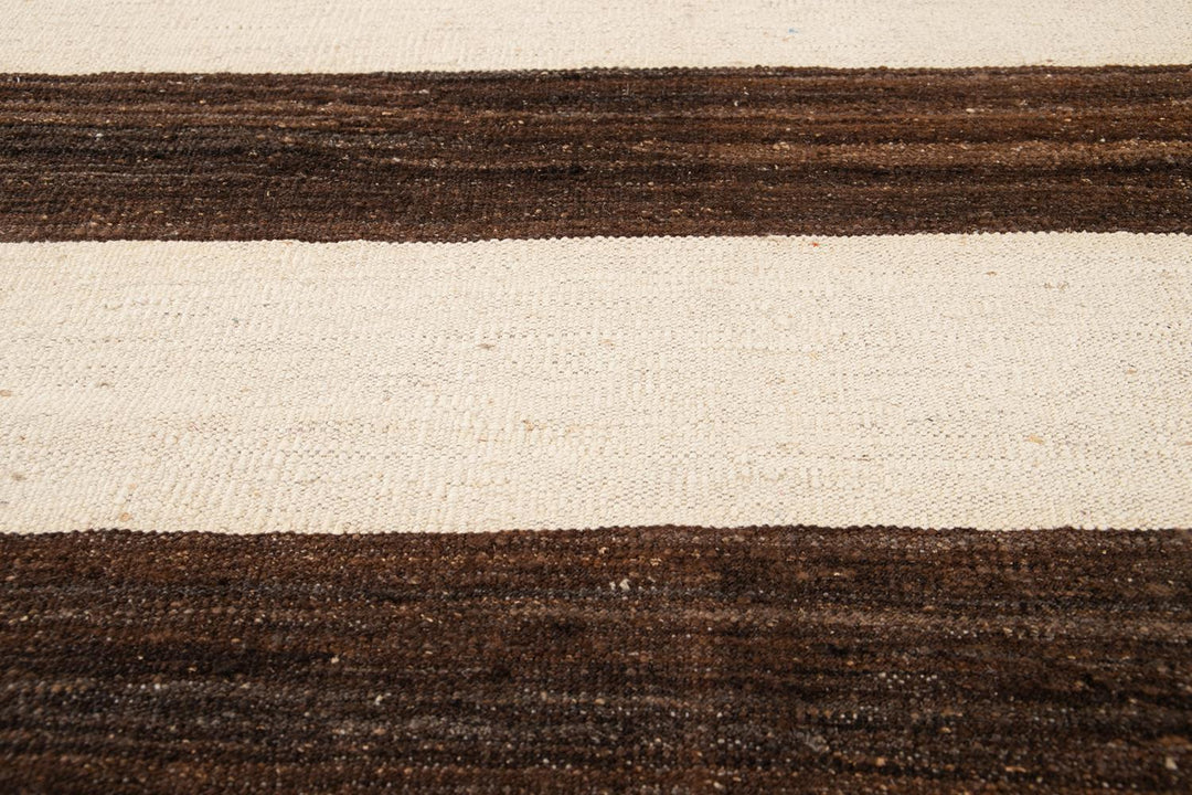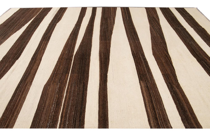 Beautiful hand-knotted wool, modern Kilim rug. This rug has ivory and brown striped field all-over.