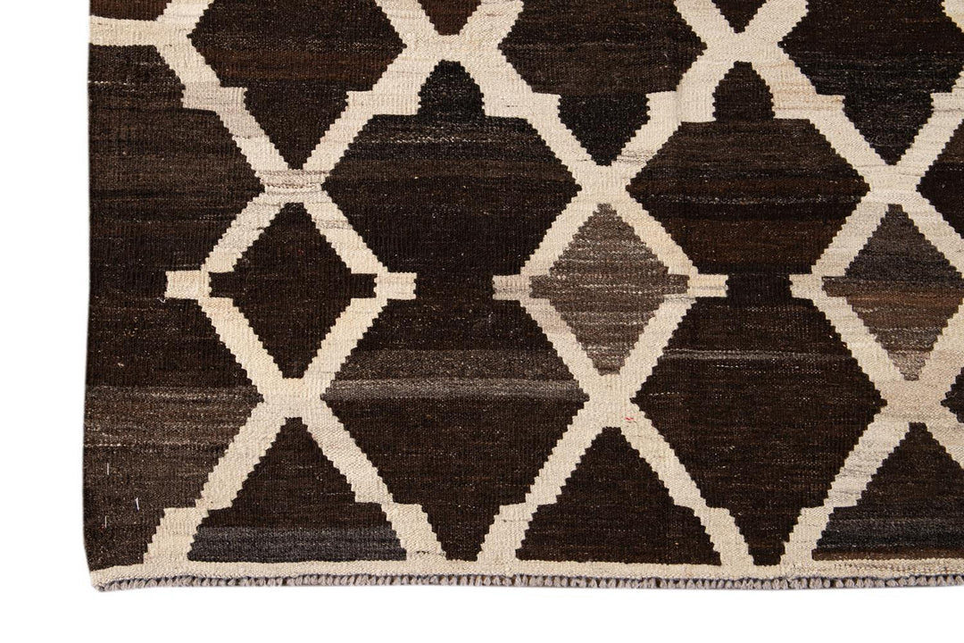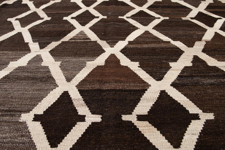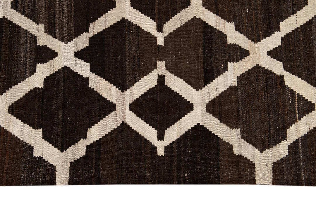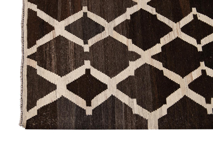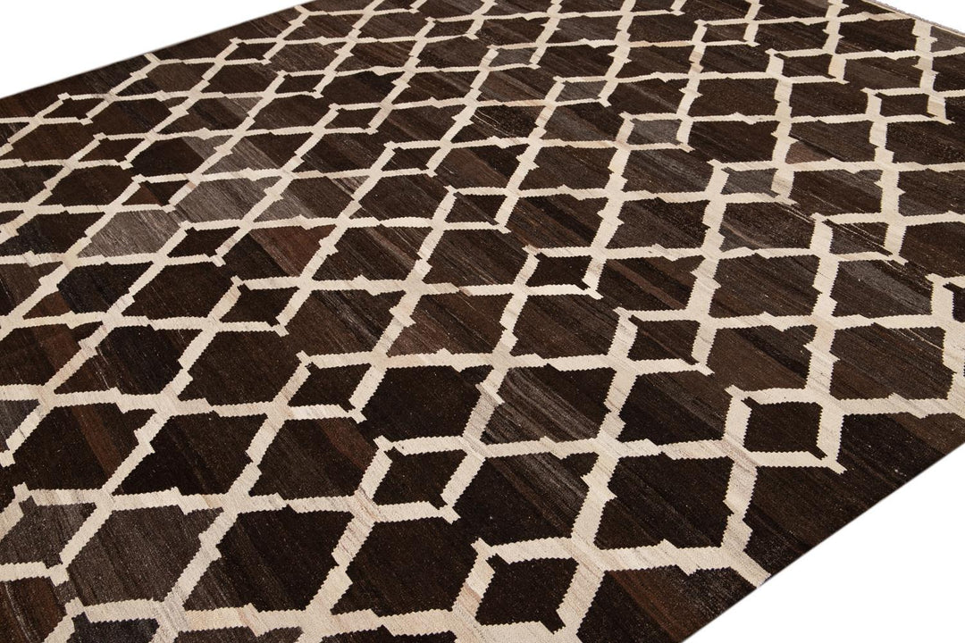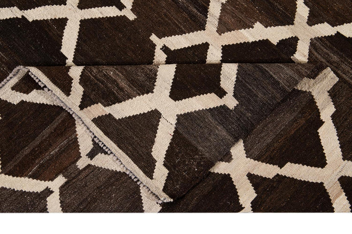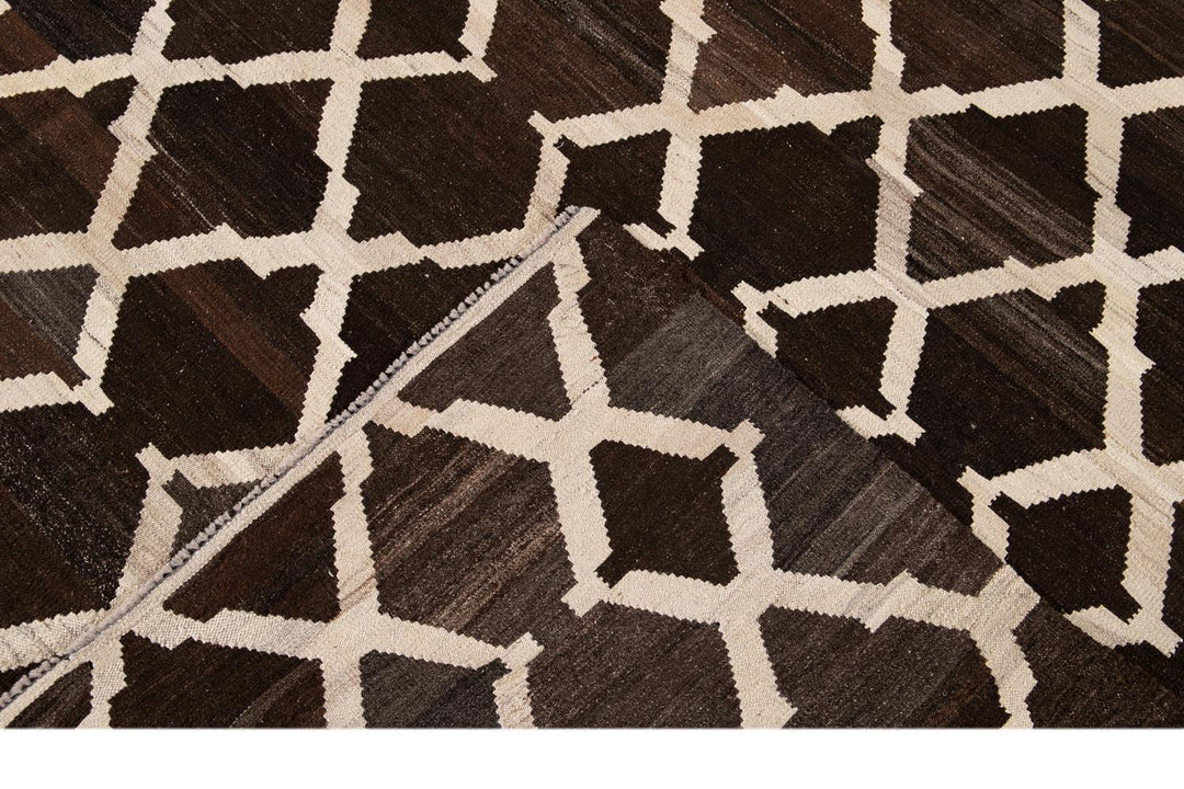 Beautiful hand-knotted flatweave kilim wool rug. This rug has a dark brown field with ivory accents in an all-over tracery design.