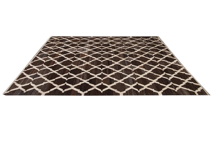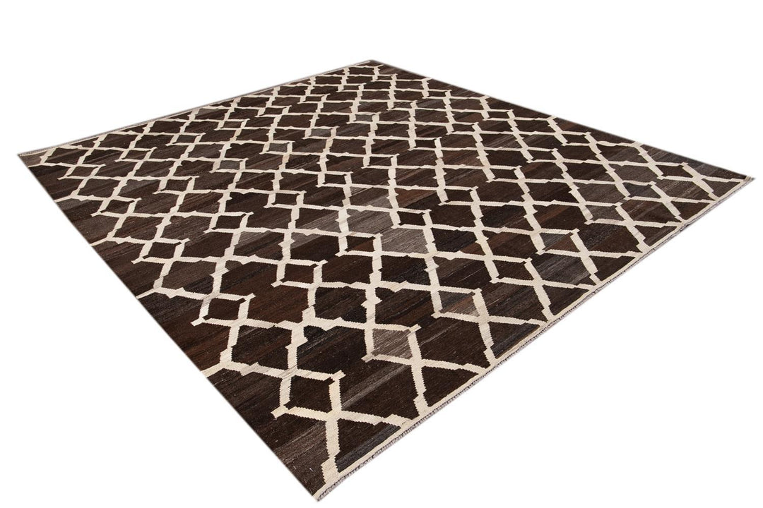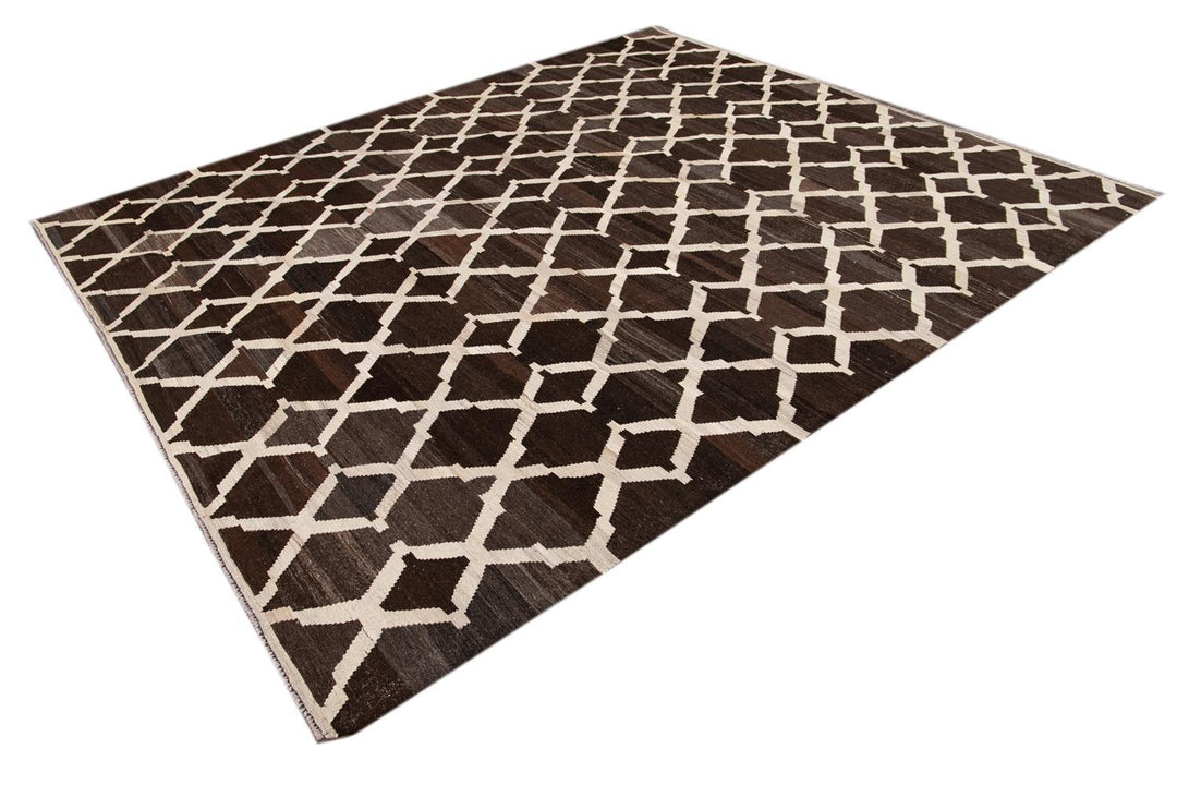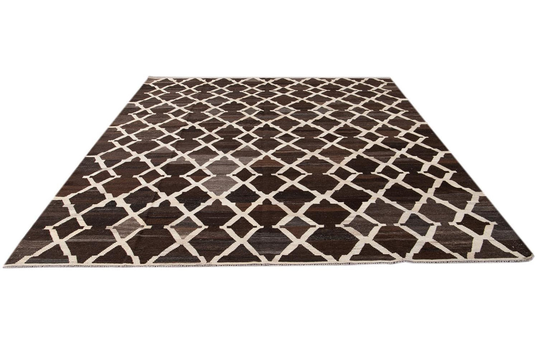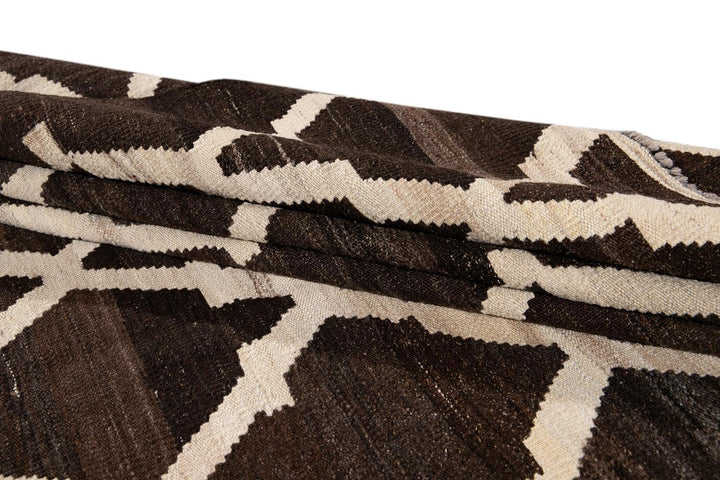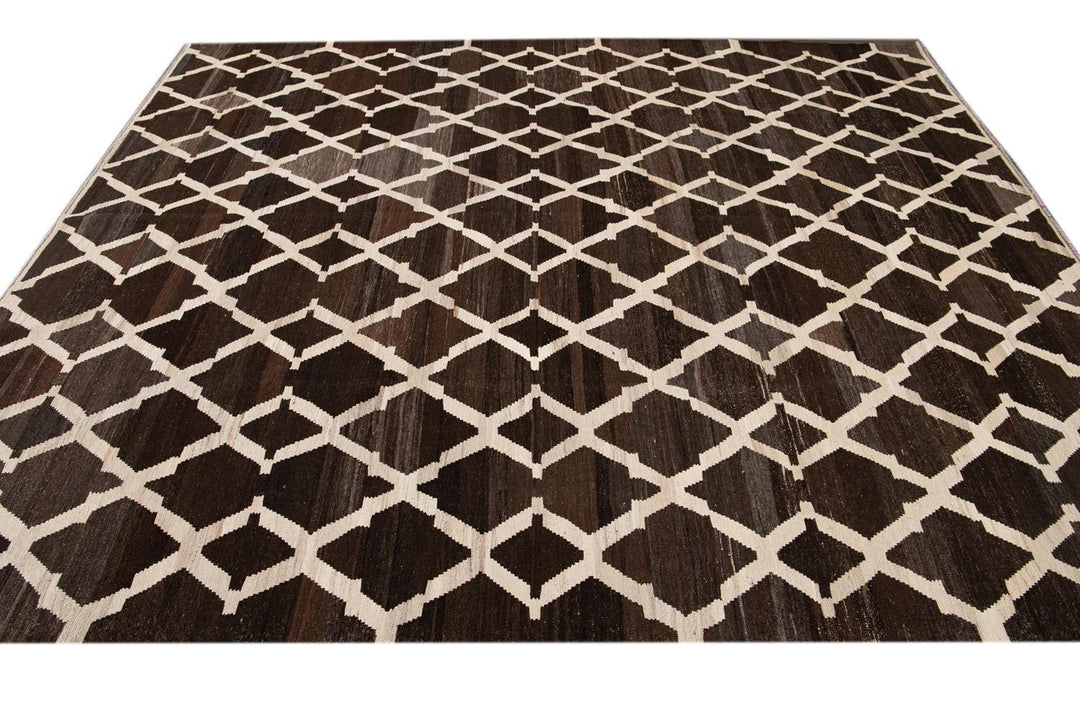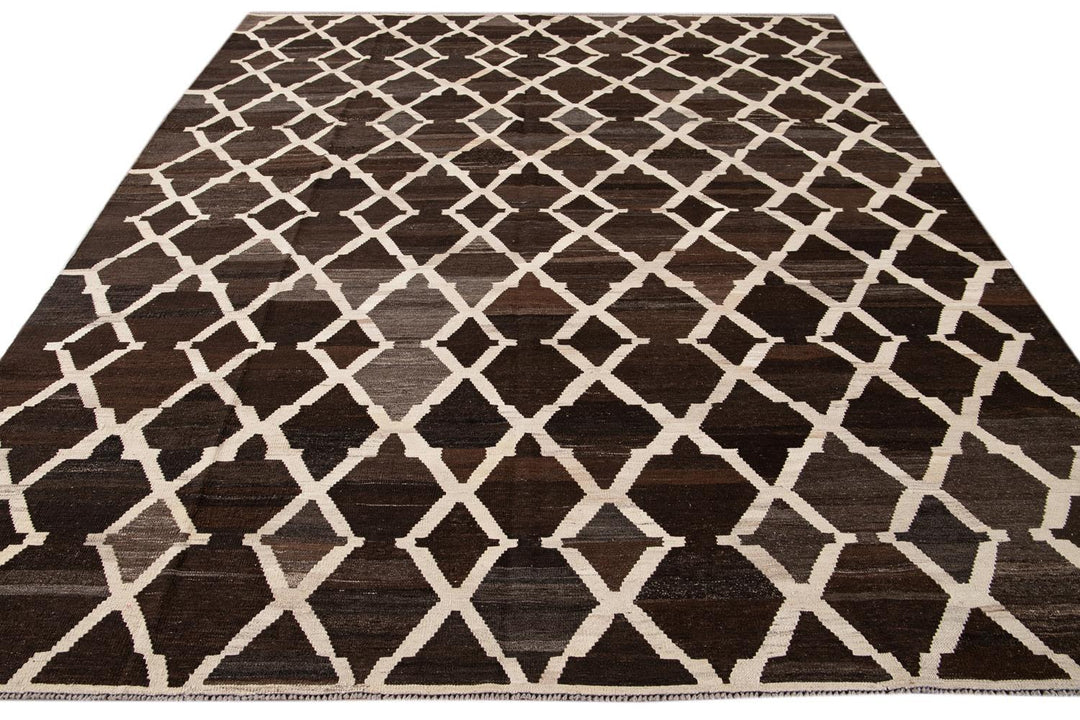 Beautiful hand-knotted flatweave kilim wool rug. This rug has a dark brown field with ivory accents in an all-over tracery design.