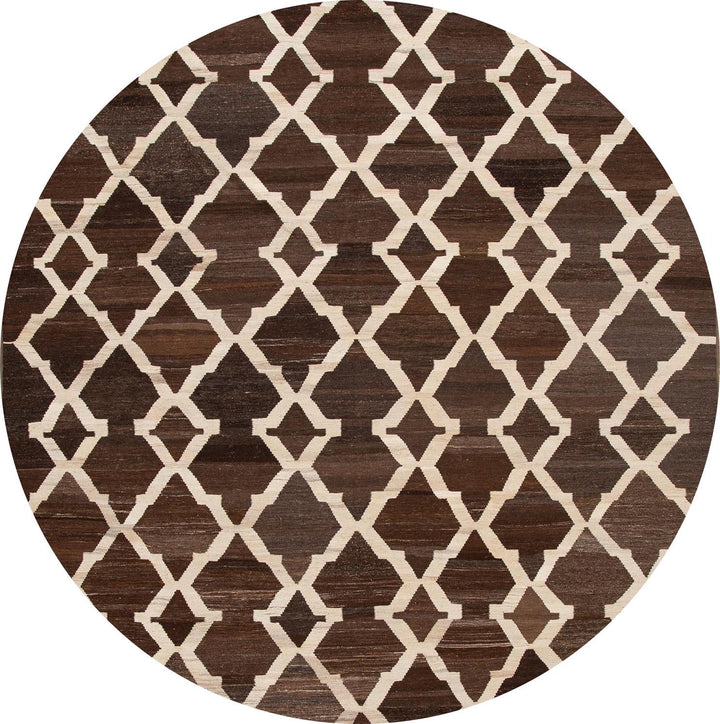 Beautiful hand-knotted wool, contemporary Turkish Kilim rug. This rug features a brownfield with an ivory interlocking geometric pattern.