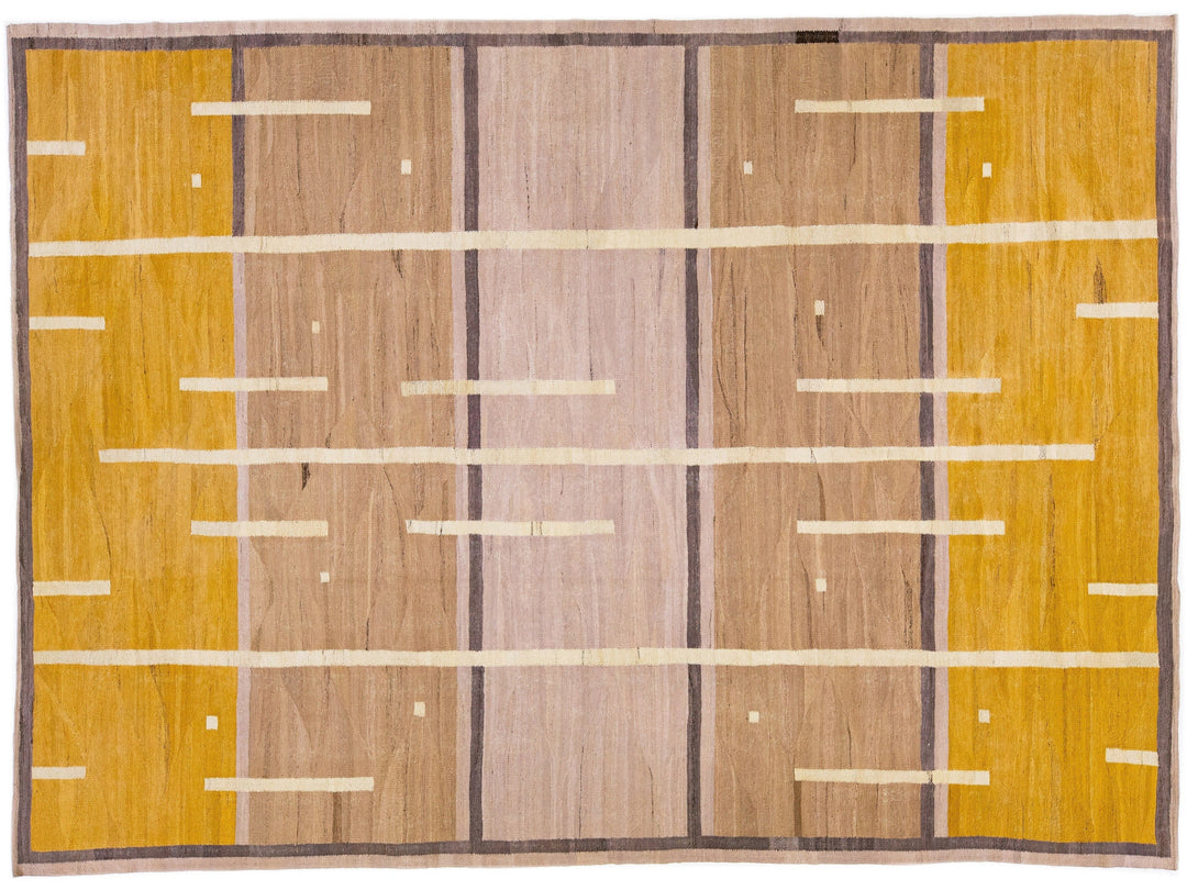This Deco flatweave wool rug exhibits a captivating brown field with yellow and beige accents, creating a contemporary and aesthetically-pleasing abstract effect. Offering a unique combination of durability and beauty, this rug will enhance any room with its bold color palette and eye-catching designs.