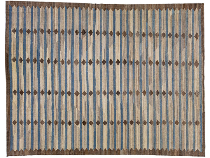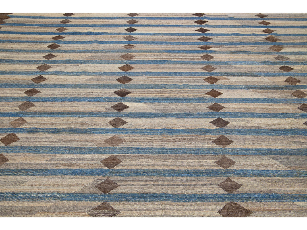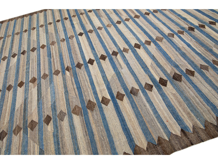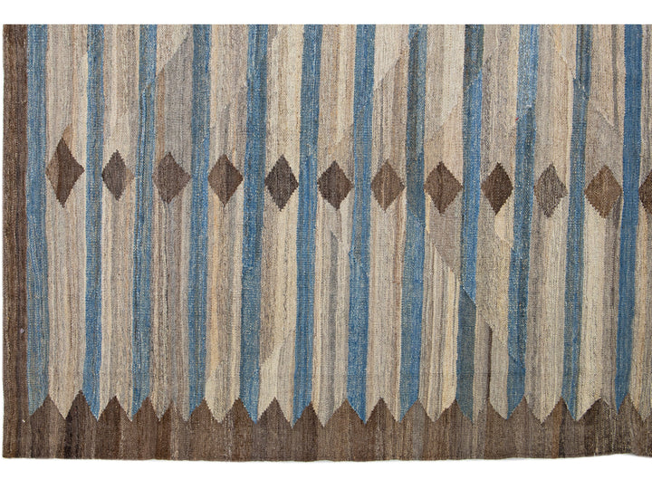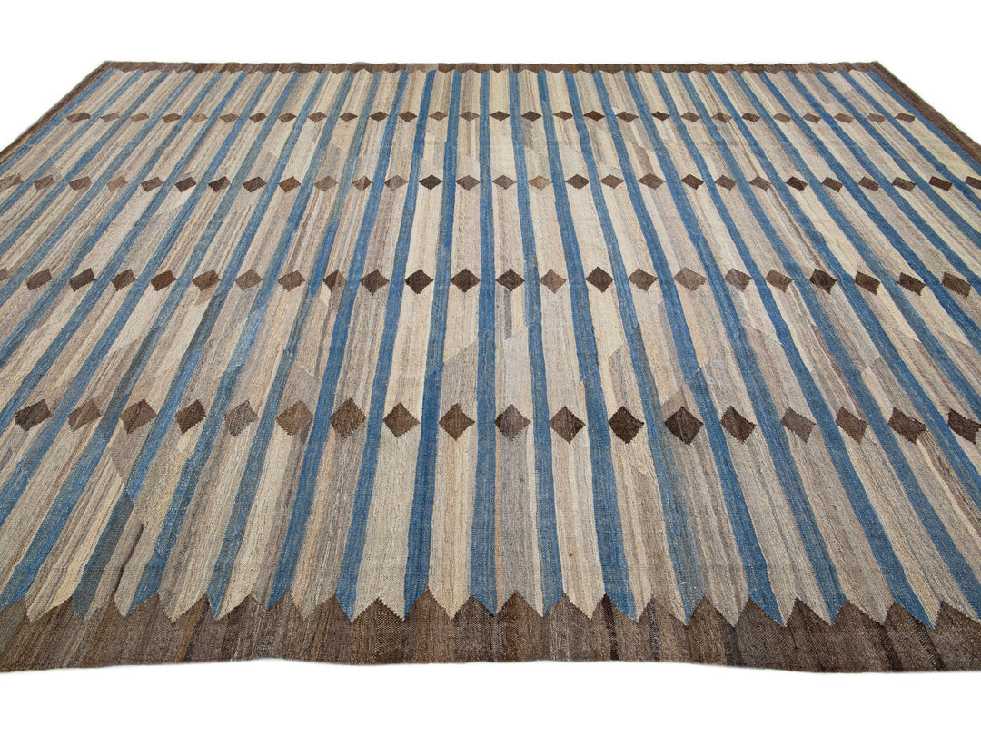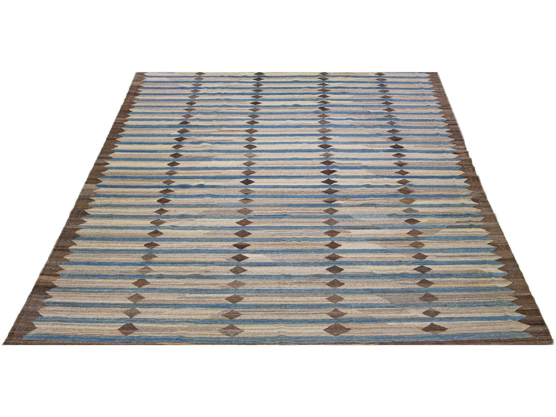 This Deco flatweave wool rug exhibits a fascinating brown color field with blue accents, creating a contemporary and aesthetically-pleasing Geometric design. This classic design motif can be incorporated into any room, providing a stylish and timeless look that works in traditional and modern spaces.