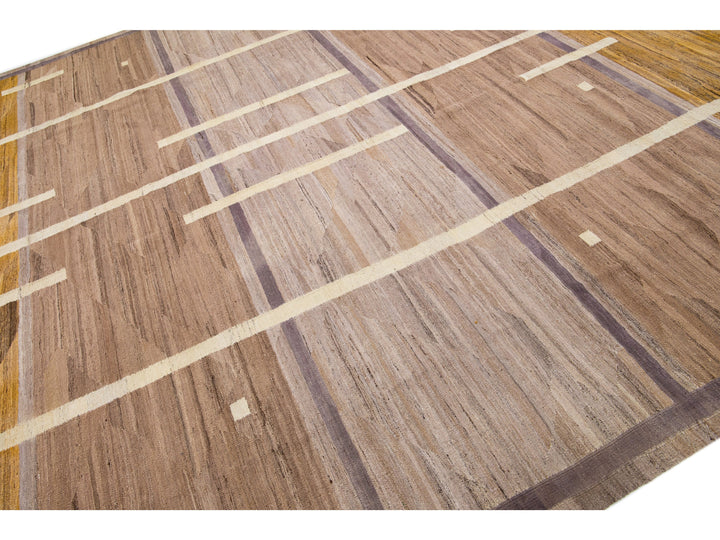This Deco flatweave wool rug exhibits a captivating brown field with yellow and beige accents, creating a contemporary and aesthetically-pleasing abstract effect. Offering a unique combination of durability and beauty, this rug will enhance any room with its bold color palette and eye-catching designs.