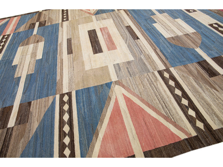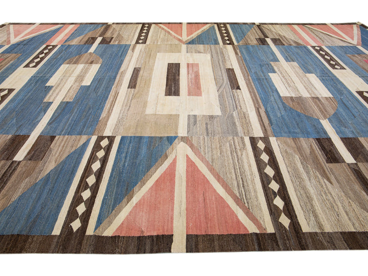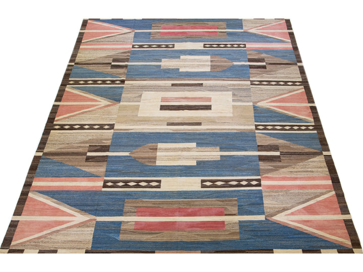 This flatweave wool rug exhibits a captivating brown field with blue and salmon color accents, creating a contemporary and aesthetically-pleasing geometric effect. This fashionable design is crafted with a unique wool blend, ensuring superior durability and resilient colorfastness.