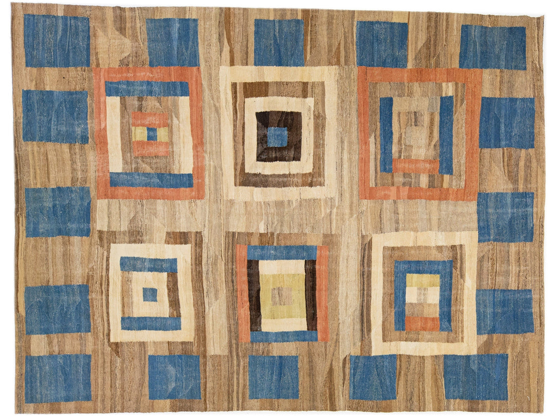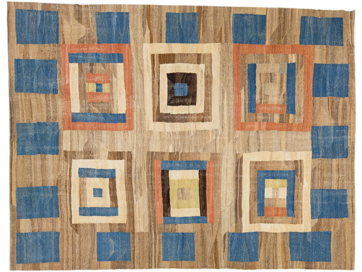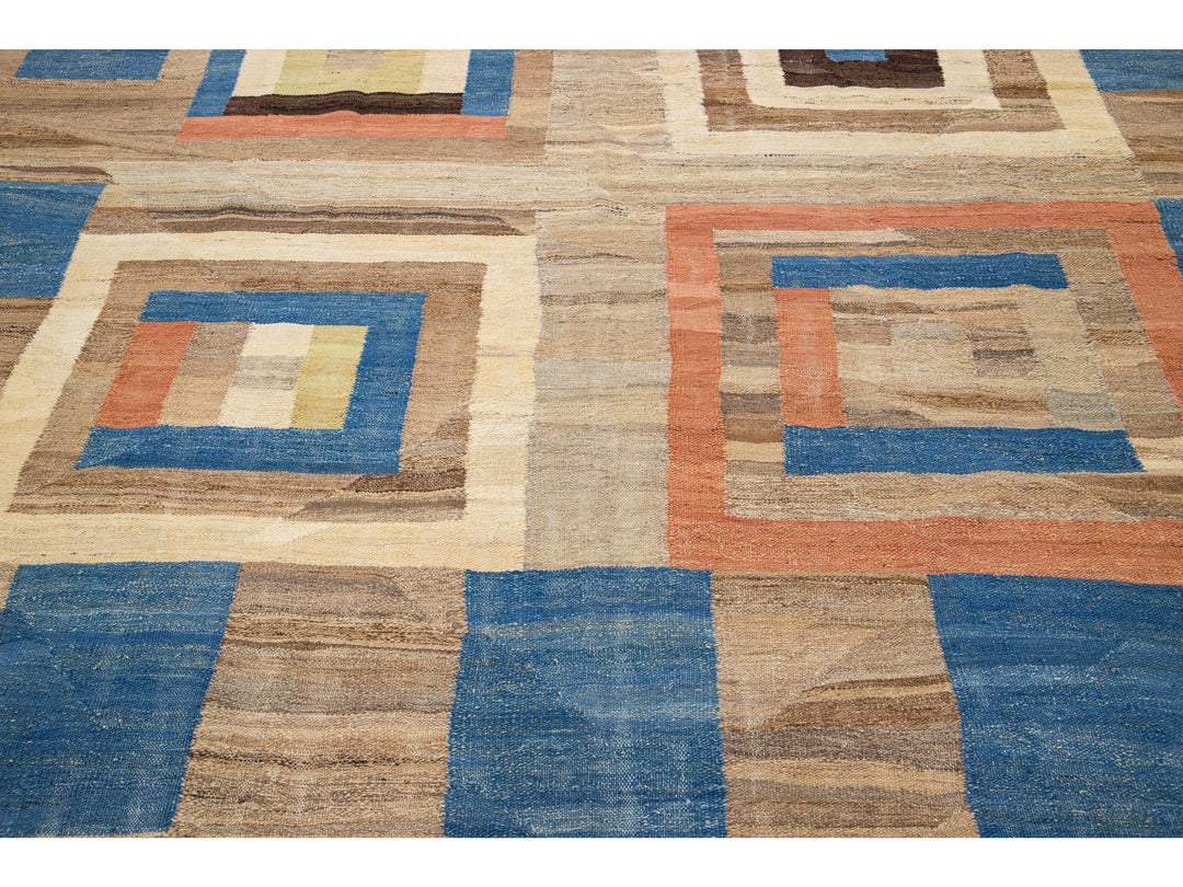Beautiful Contemporary Kilim wool rug with a brown color field. This flatweave rug features a gorgeous geometric deco design in beige, orange, and blue accents. Combining brown, beige, orange, and blue creates visually stunning geometric shapes, perfect for any decor style.