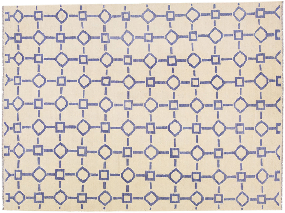 This modern Kilim rug exudes elegance with its finely woven flat-weave wool, presented in a captivating ivory hue complemented by a stunning geometric pattern with accents of blue.