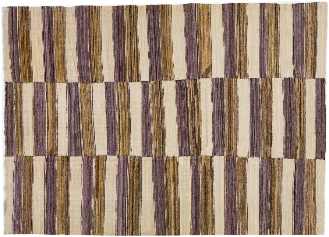 This contemporary kilim wool rug showcases a detailed and lively stripe design incorporating shades of beige, brown, and tan throughout.