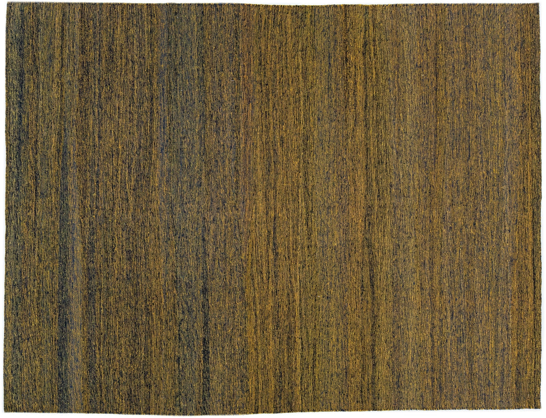 A modern Turkish Kilim rug, meticulously crafted by hand, displays an exquisite array of intricate golden-brown stripes spanning the entirety of the rug's surface.