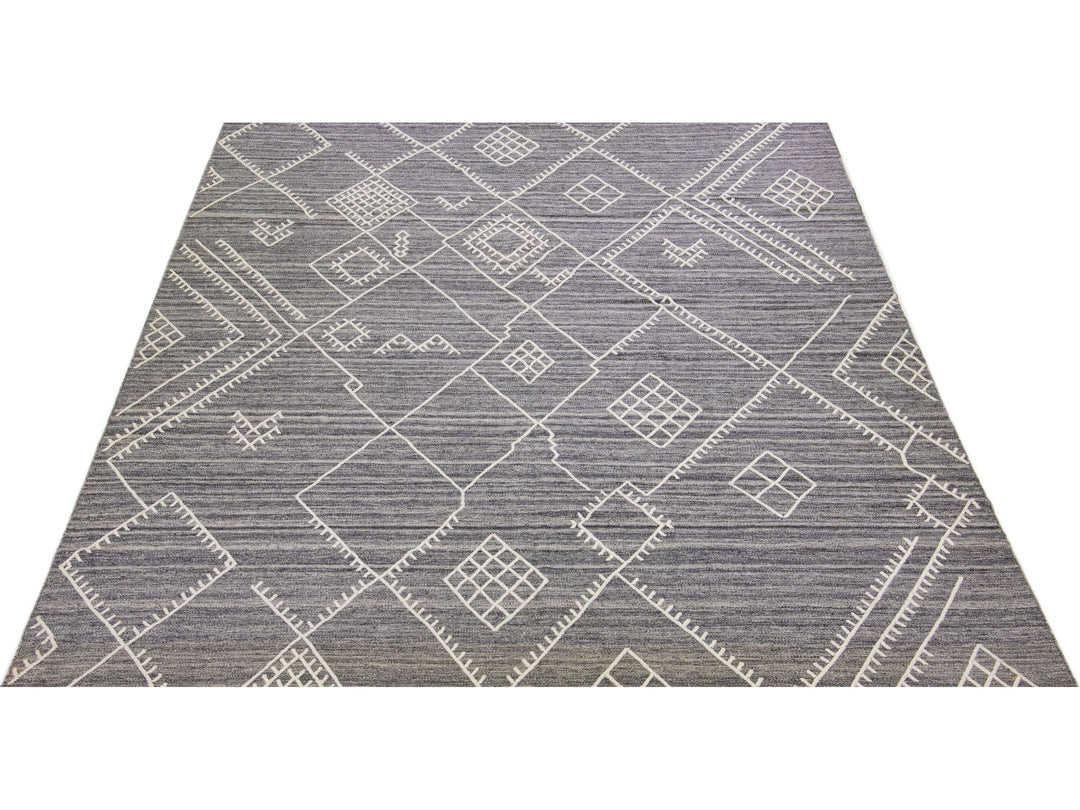Beautiful kilim handmade wool rug with a gray field. This custom modern flatweave rug of our Nantucket collection has white accents and a gorgeous, all-over geometric coastal design.
