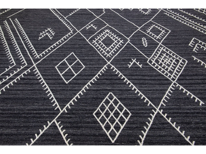 Beautiful kilim handmade wool rug with a grey-charcoal field. This custom modern flatweave rug of our Nantucket collection has white accents and a gorgeous, all-over geometric coastal design.
