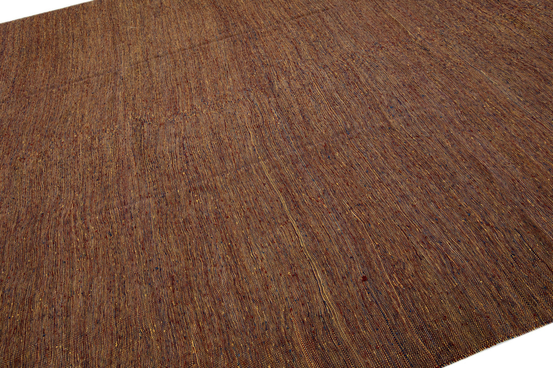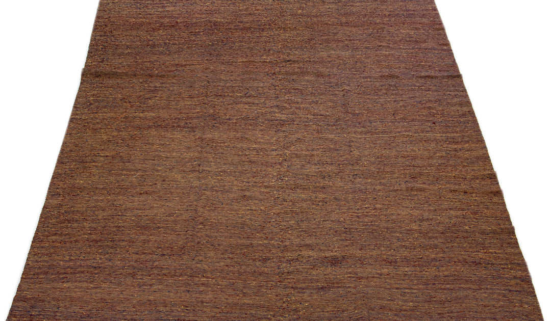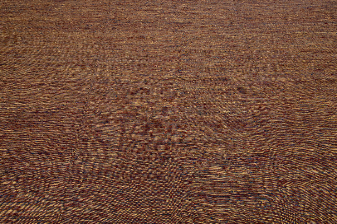 This contemporary Turkish kilim rug showcases a rich brown hue as its main color base, complimented by an intricate and vibrant dotted design that extends across its entirety, creating a visually striking aesthetic.