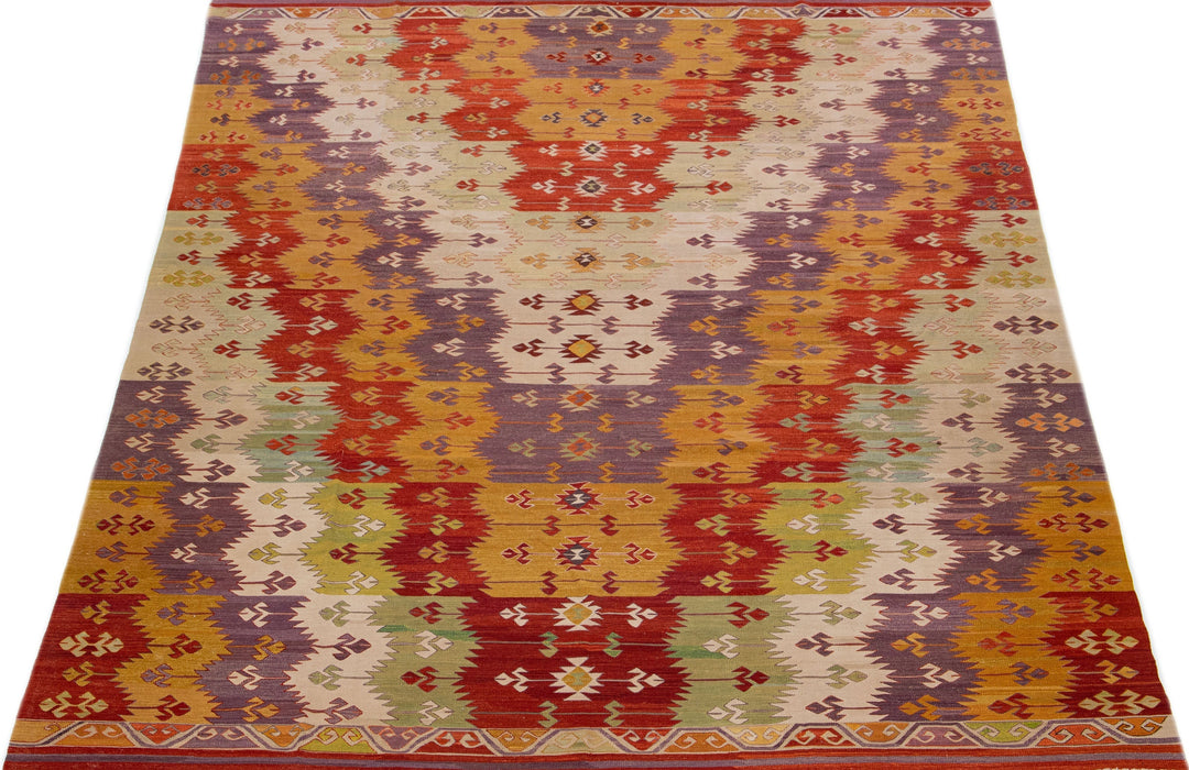 This modern kilim rug of Turkish origin features a vibrant and intricate all-over geometric pattern that combines red, green, purple, and orange colors, rendering it a timeless addition to 21st-century interior design.