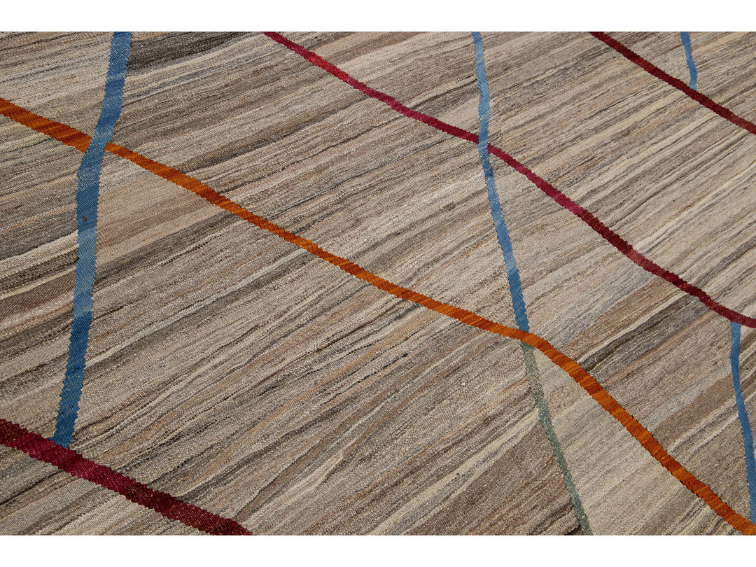 Beautiful hand-knotted modern flat-weave Kilim square wool rug. This rug has a tan field with orange, blue, and purple accents in a geometric design.