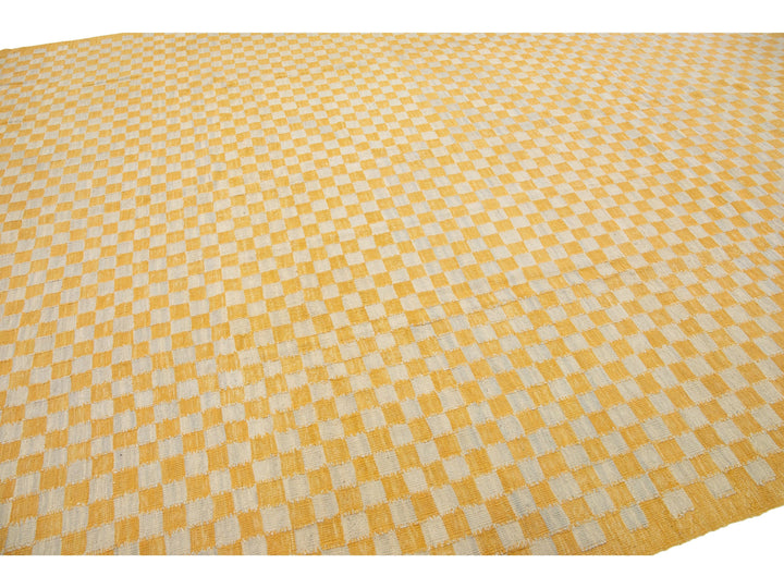 Modern Kilim Handmade Wool Rug With a Goldenrod Checker Pattern