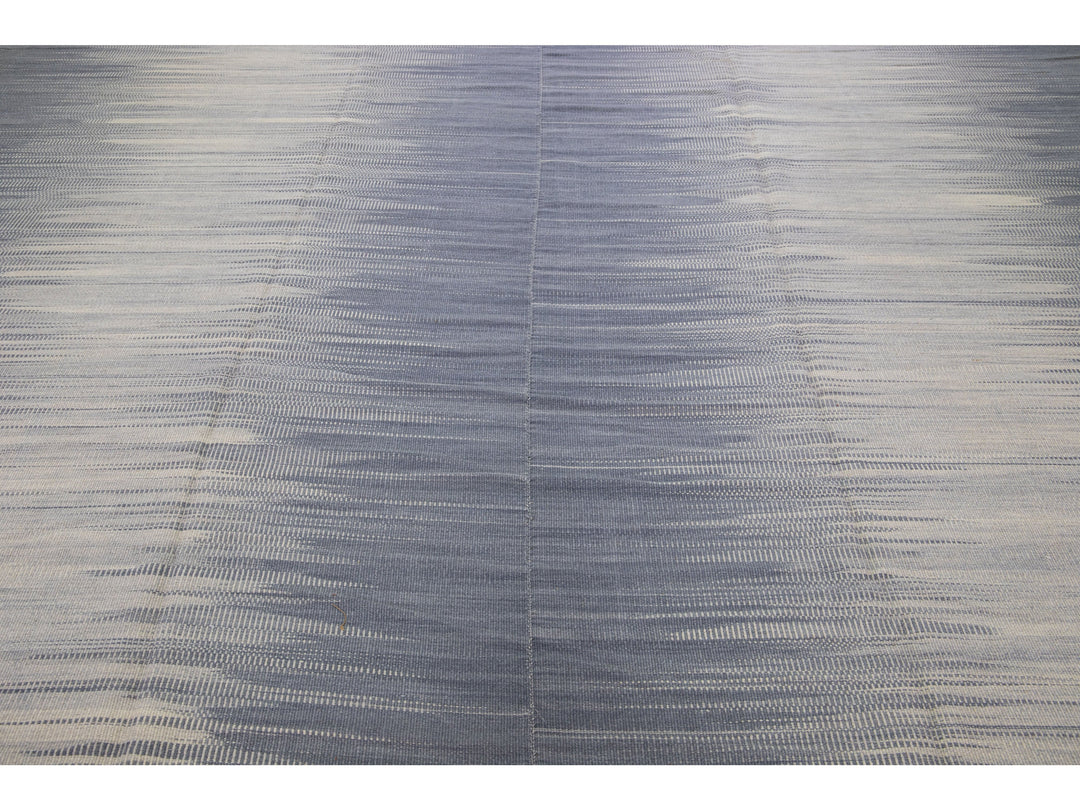 Beautiful modern Kilim flat-weave wool rug in a gray color field with accents of beige in a gorgeous Abstract design.