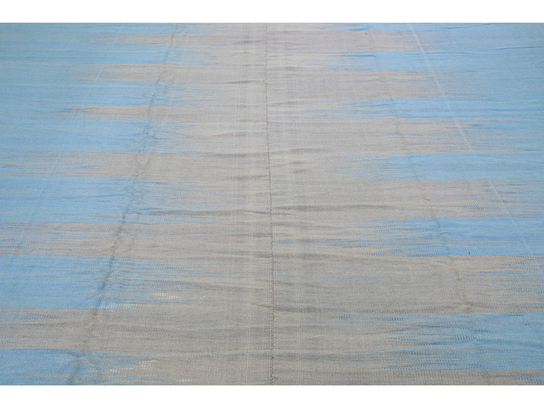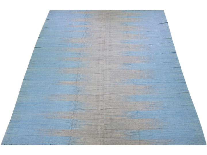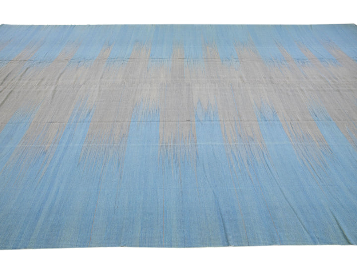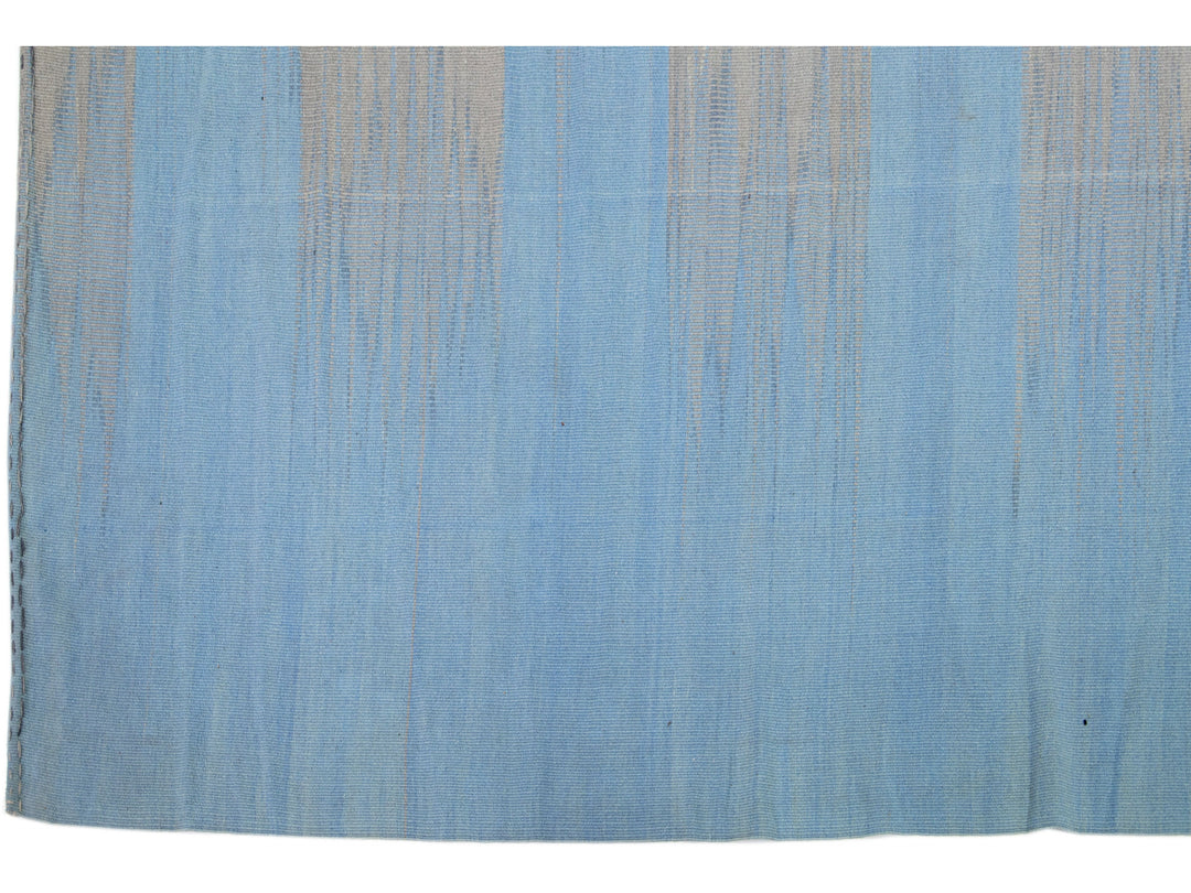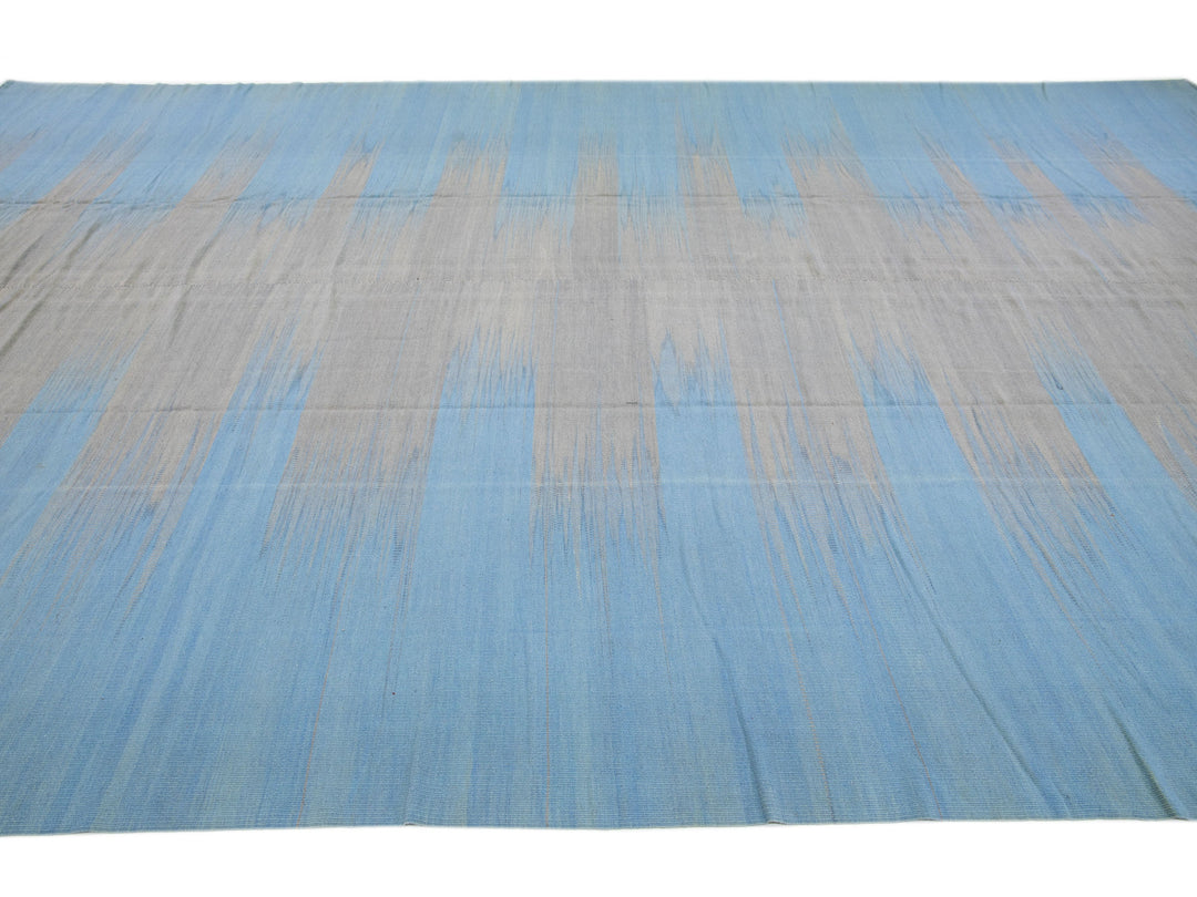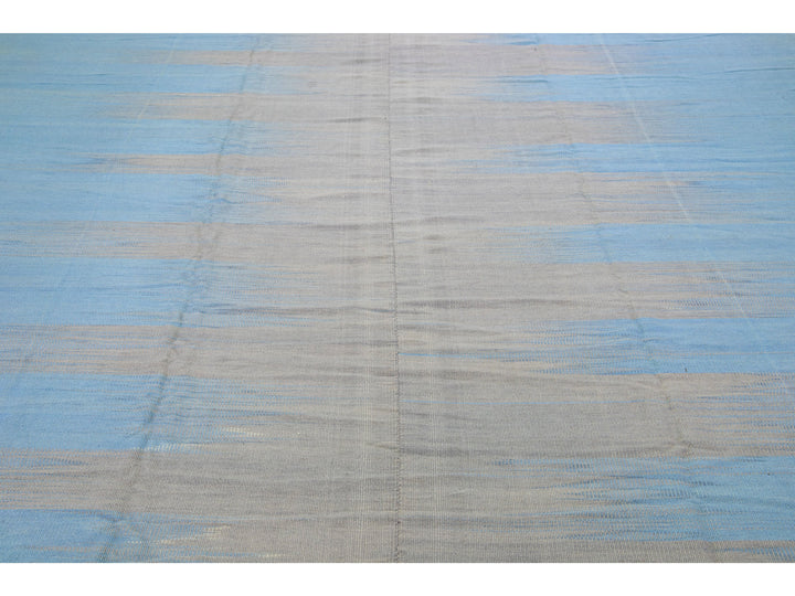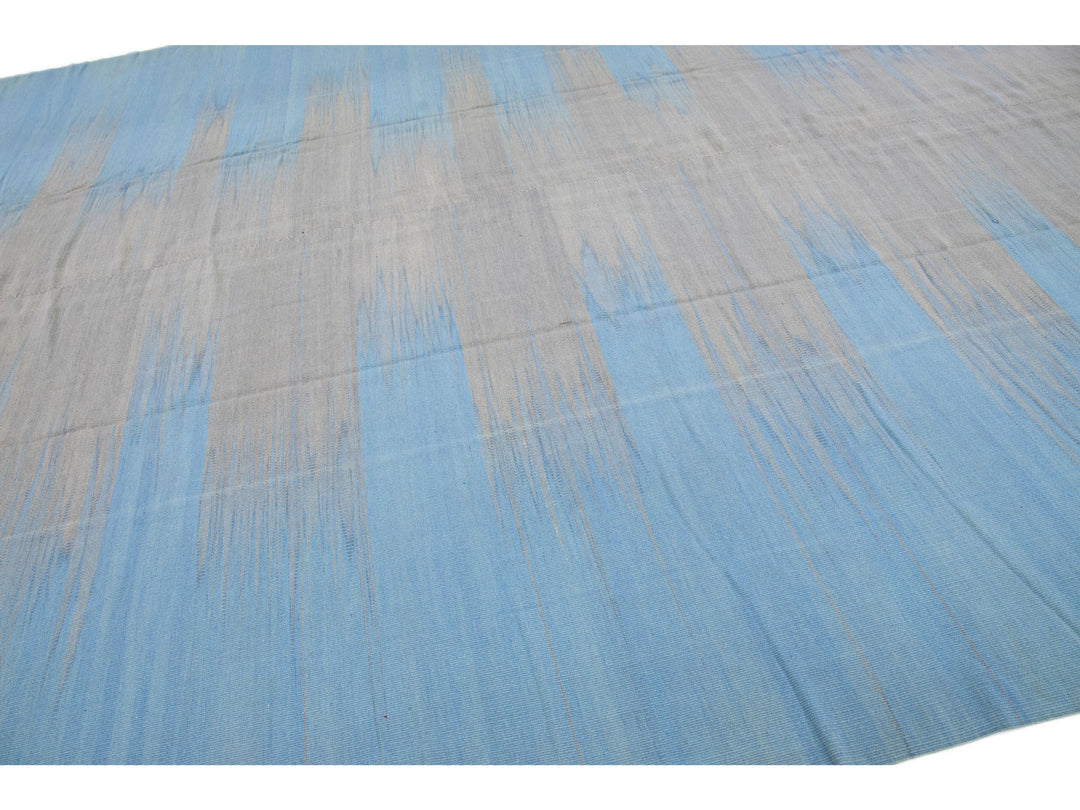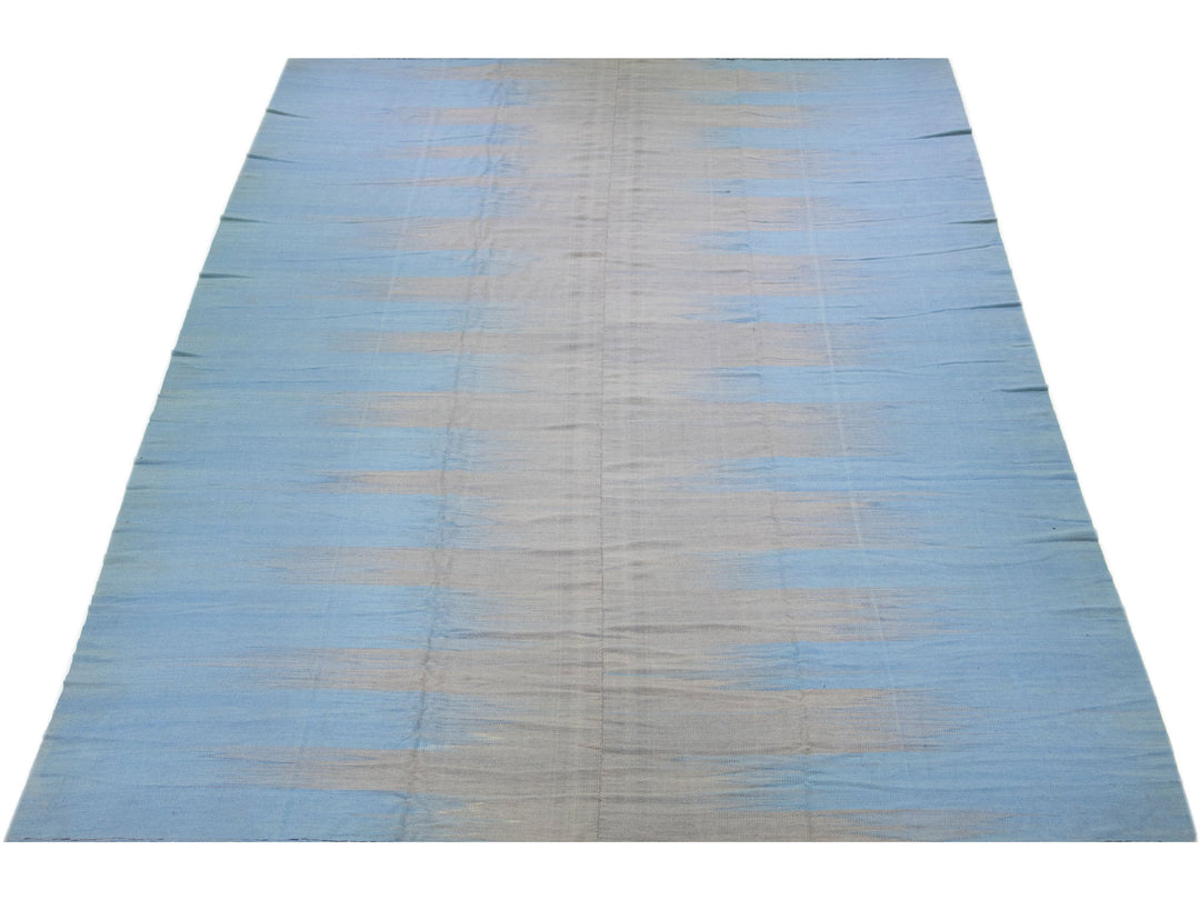 Beautiful modern Kilim flat-weave wool rug in a blue color field with accents of gray in a gorgeous Abstract design.