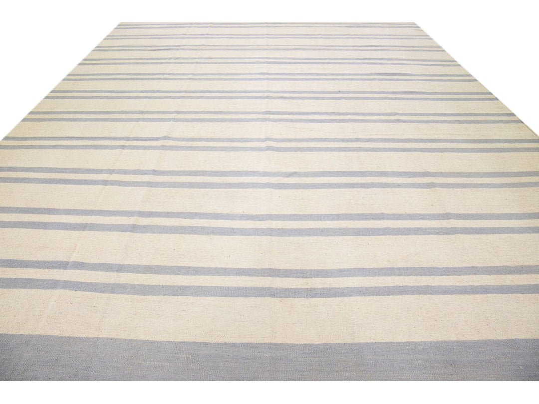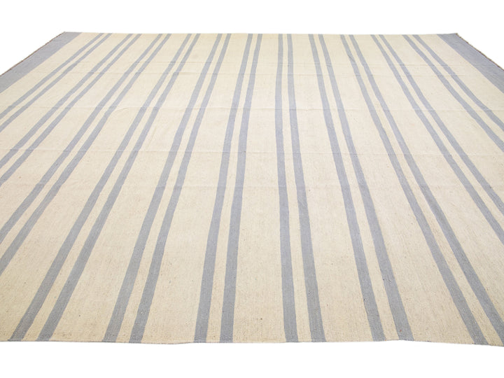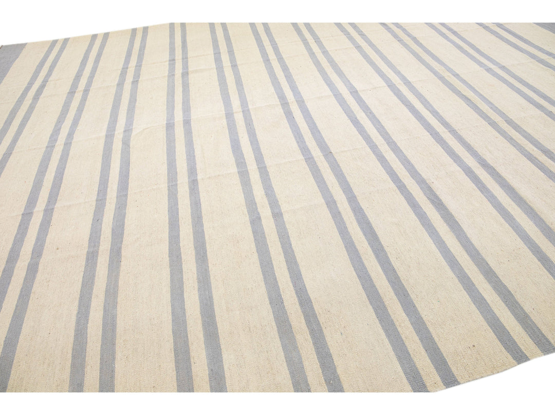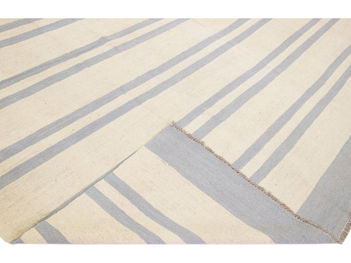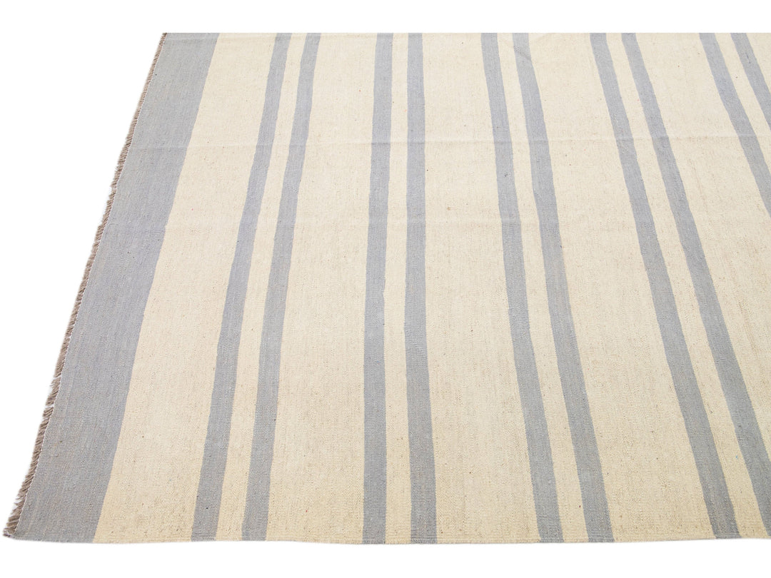 Beautiful Modern flat-weave Kilim handmade wool rug with a beige color field. This Kilim rug has gray accents in a gorgeous stripe design.