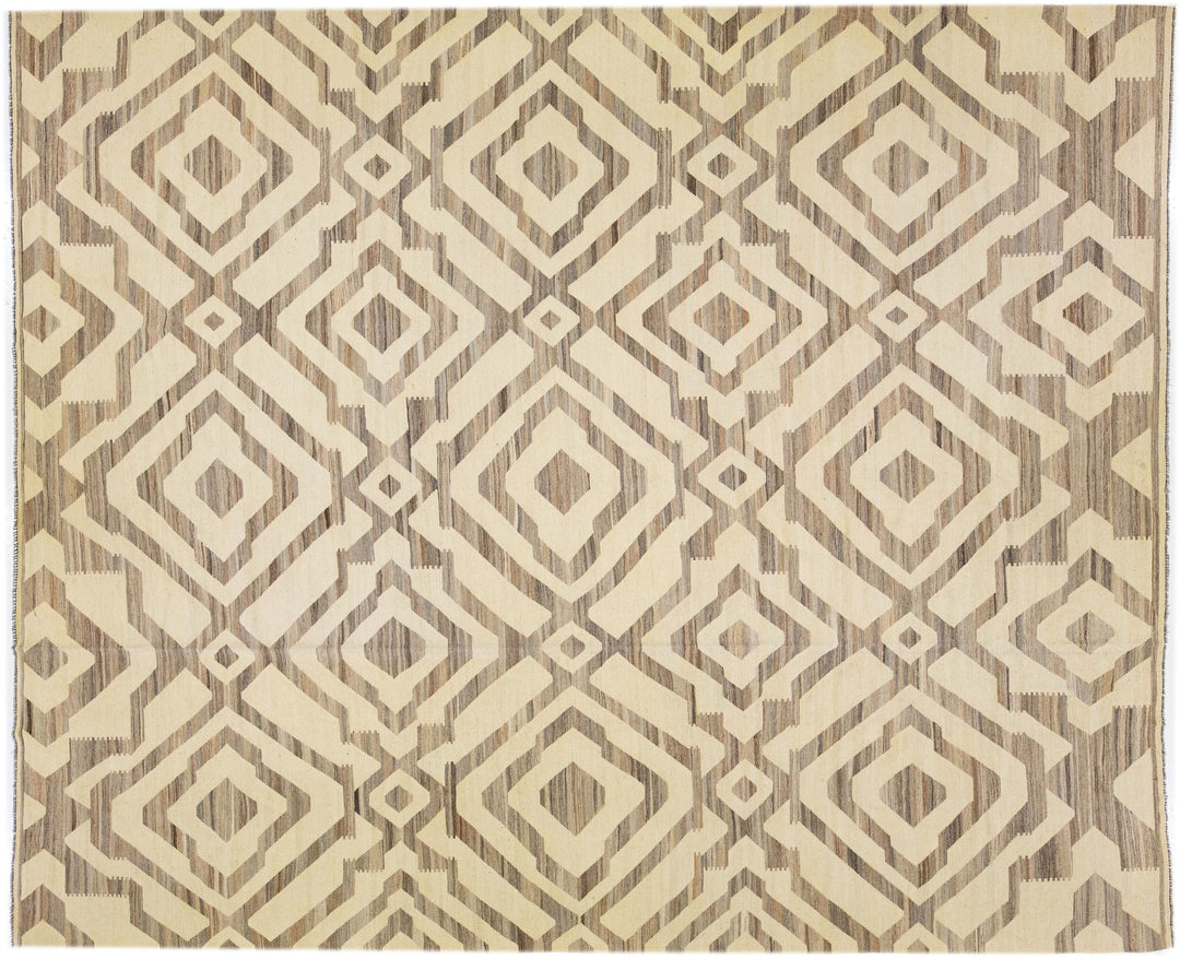 This exquisite Kilim rug features a contemporary geometric pattern on a neutral beige background, expertly crafted with hand-knotted wool. This piece is a stunning addition to any modern decor scheme, complemented by understated accents of rich brown hues.