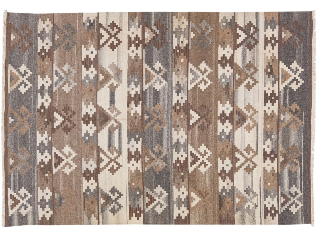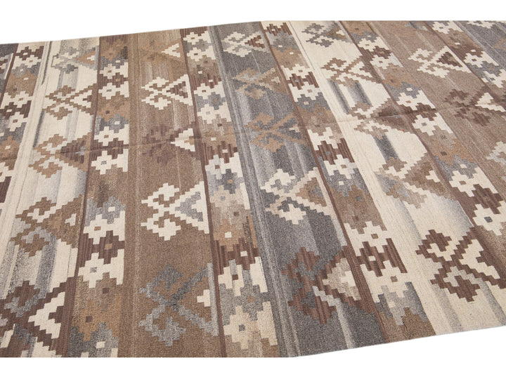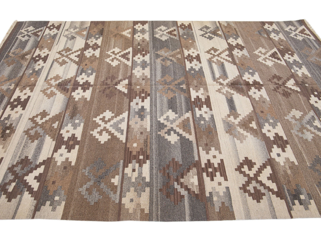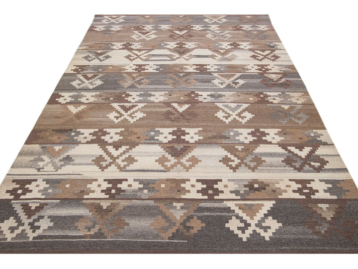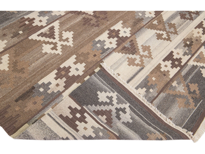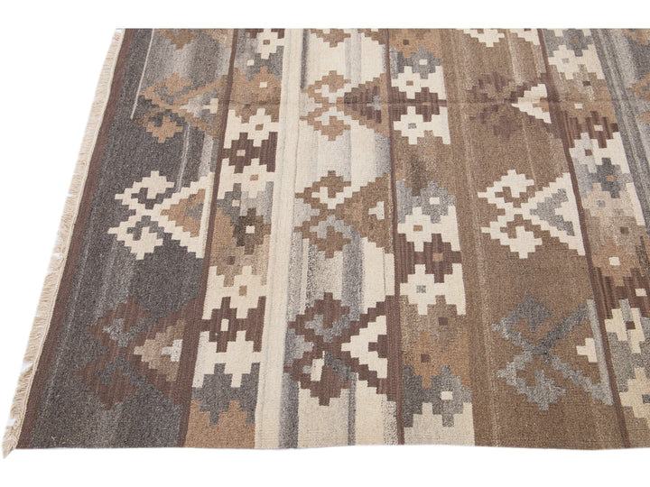 Modern Kilim Brown Flat-Weave Geometric Wool Rug