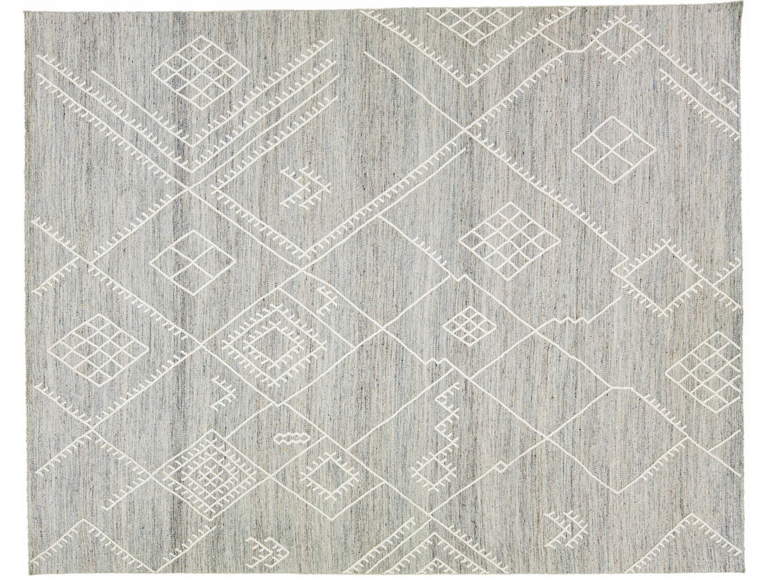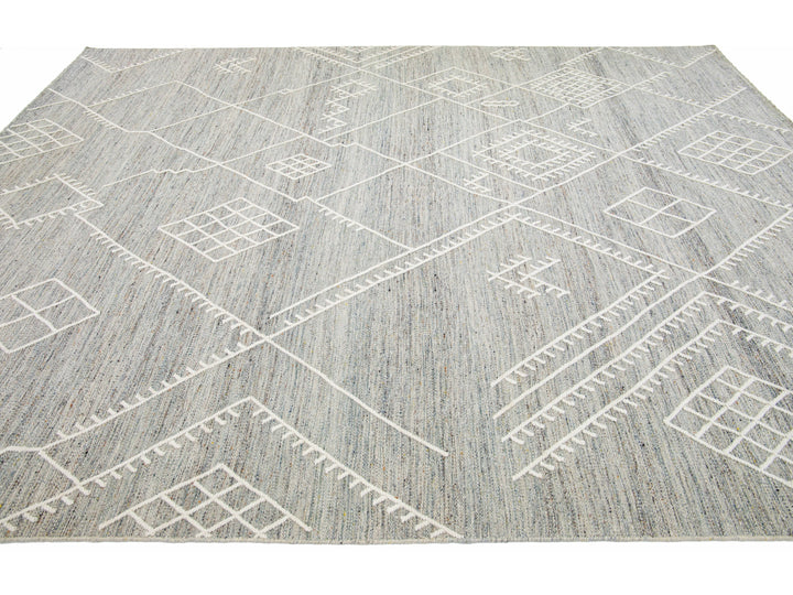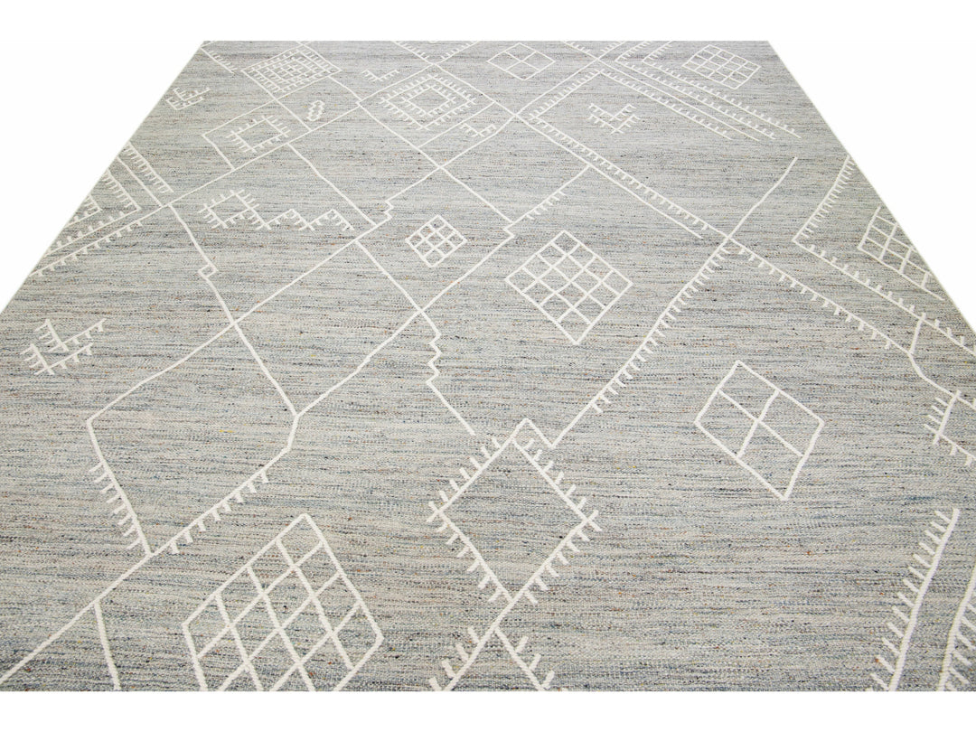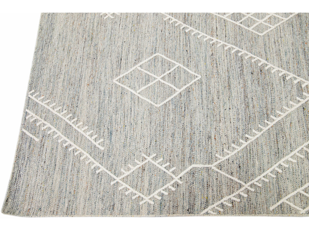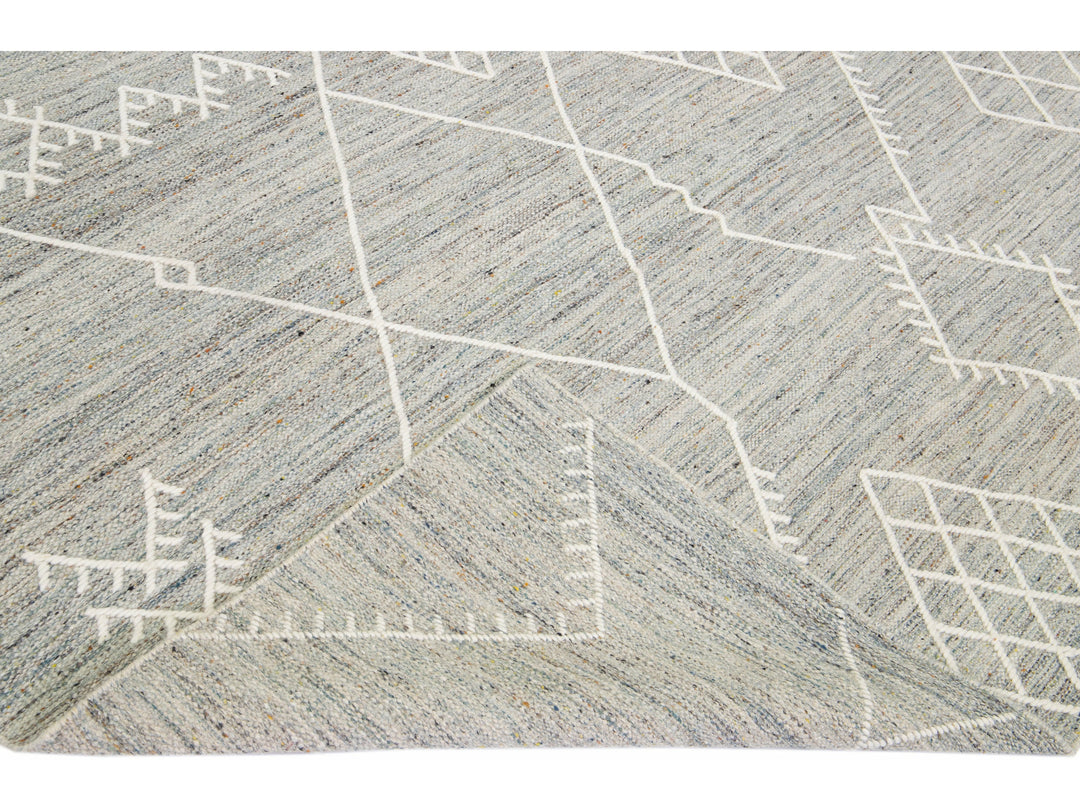 Beautiful kilim handmade wool rug with a gray field. This custom modern flatweave rug part of our Nantucket collection has ivory accents and features a gorgeous all-over geometric coastal design.