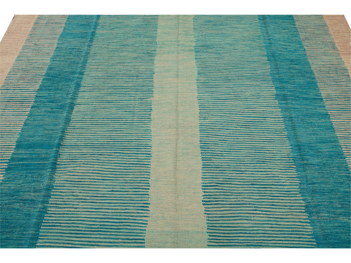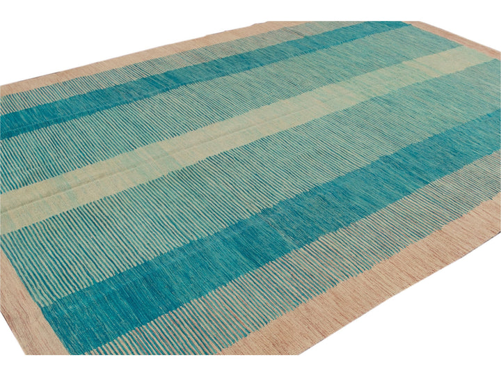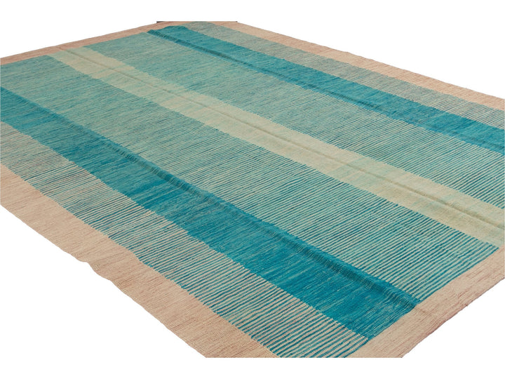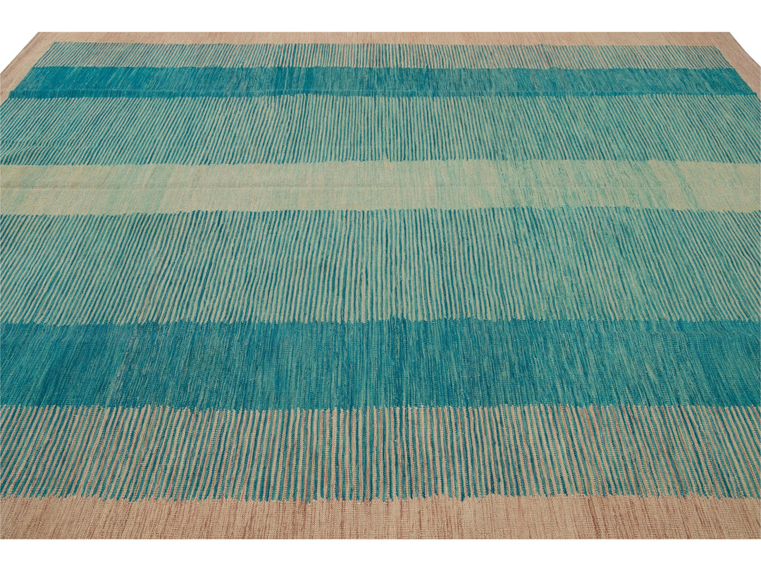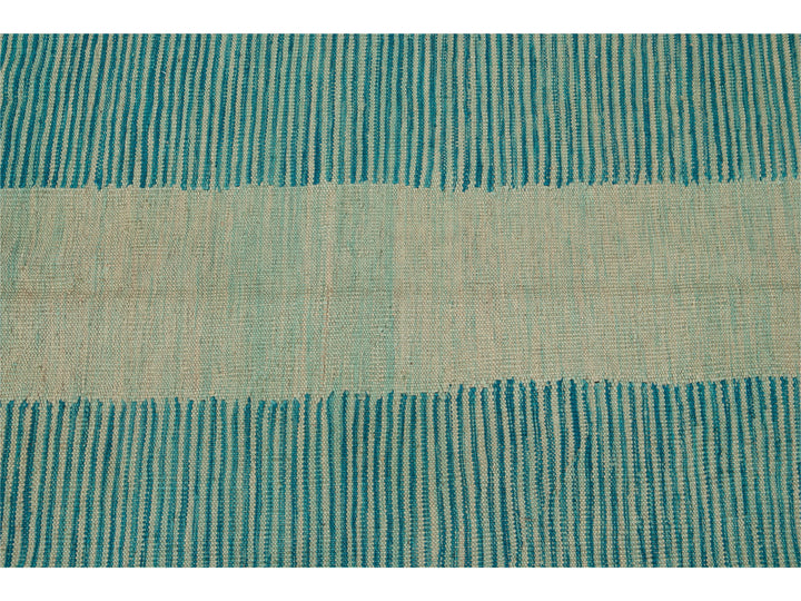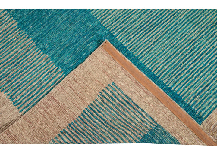 Beautiful modern flat-weave Kilim handmade wool rug with a teal field. This Kilim rug has accents of beige and blue in a gorgeous geometric Expressionist design.
