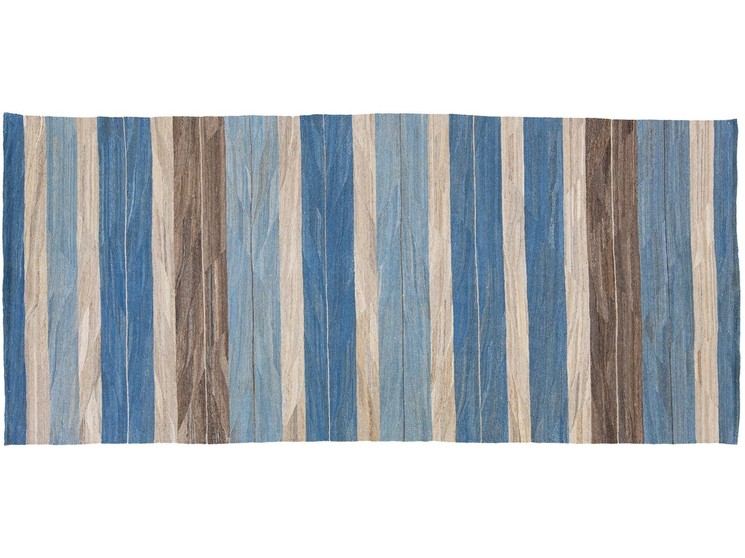Modern Striped Flat-Weave Handmade Blue and Brown Wool Runner