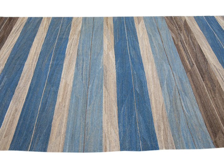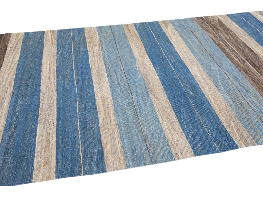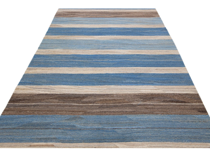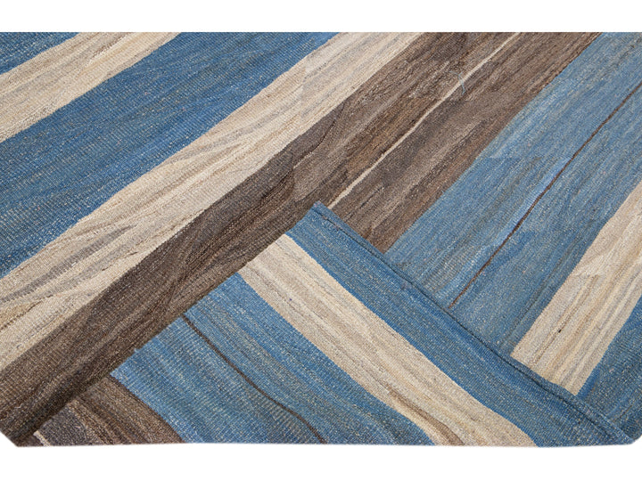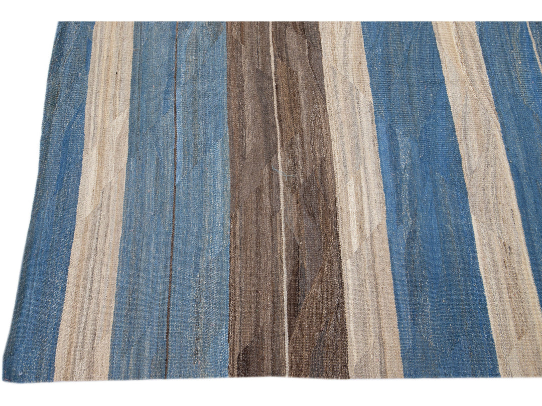 Beautiful modern flat-weave Kilim hand-knotted wool rug. This rug has a field of blue and brown colors in a gorgeous all-over geometric stripe design.