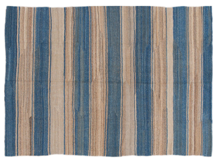 Beautiful modern flat-weave Kilim hand-knotted wool rug. This rug has a field of a blue and beige color in a gorgeous all-over geometric stripe design.