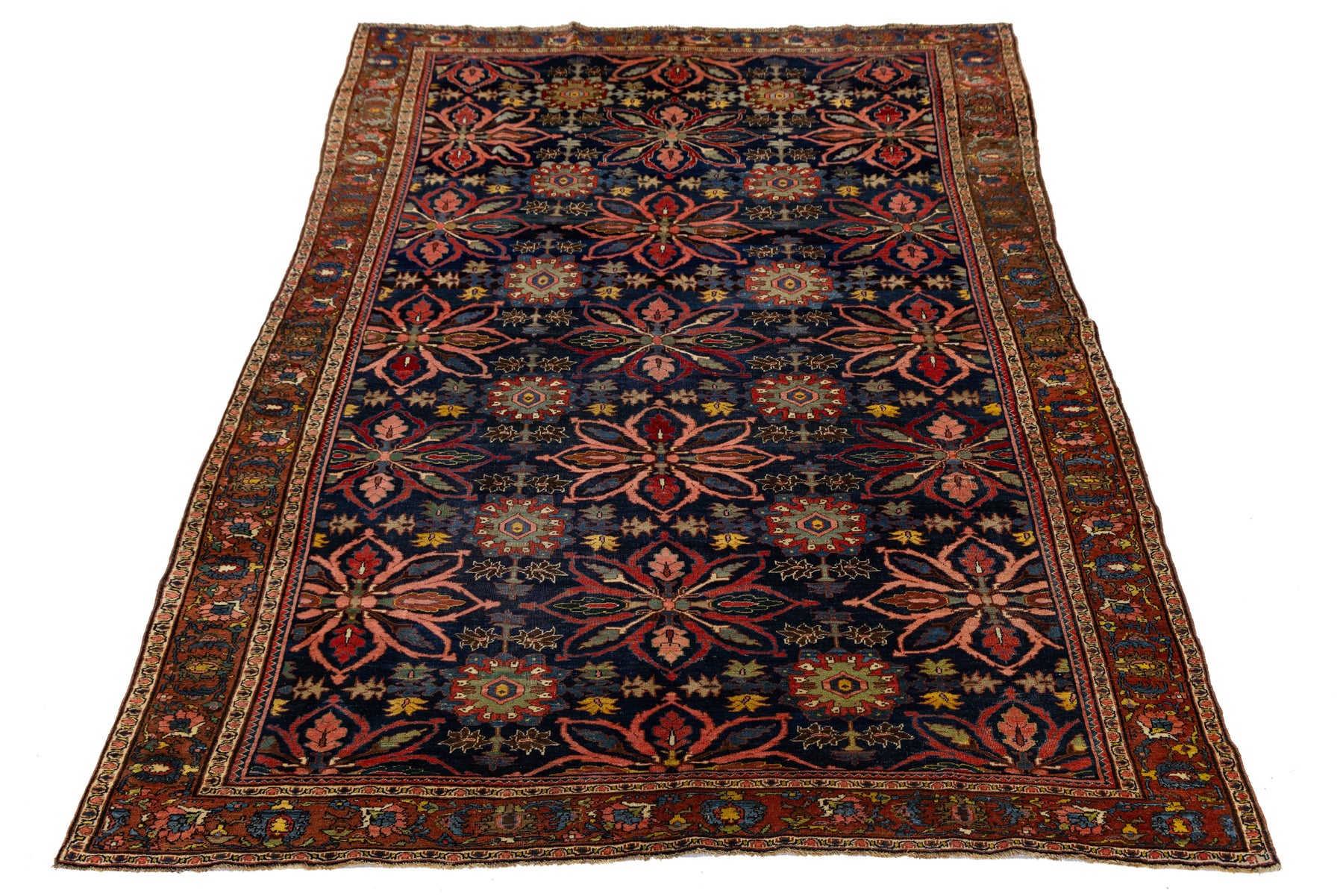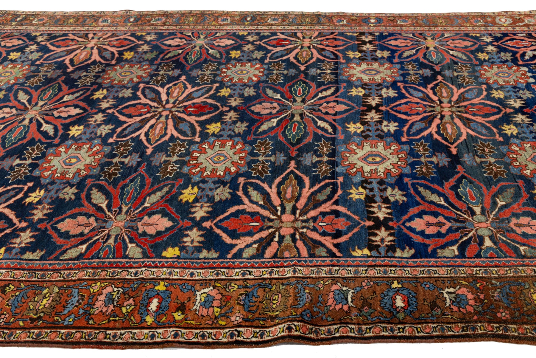 This striking antique Persian Bidjar rug features a deep midnight blue field decorated with an expansive, rhythmic arrangement of oversized floral palmettes and geometric blossoms. Known as the "Iron Rugs of Persia," this Bidjar is celebrated for its heavy, durable construction and sophisticated tribal aesthetic. Colors: Rich indigo ground with a vibrant palette of madder red, dusty pink, gold, and soft teal. This rug measures 8'5" x 13'6".