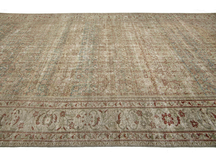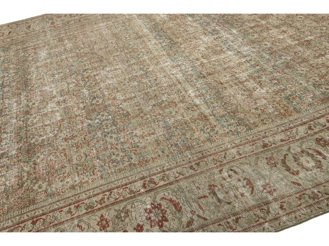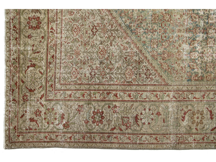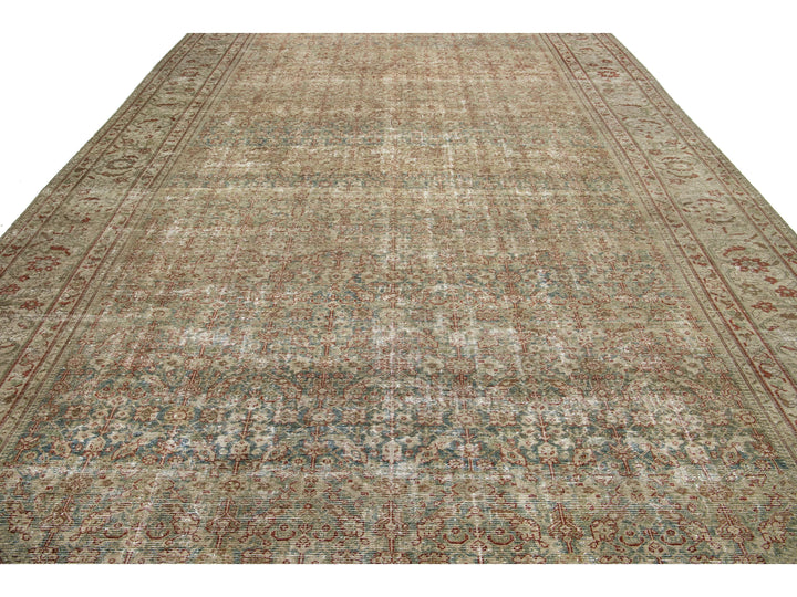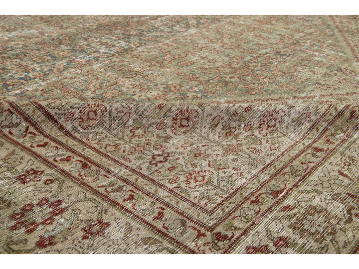 This antique Mahal hand-knotted distressed wool rug features a blue field, complemented by an all-over pattern enhanced with red, green, and tan accents. This rug measures 10'2" x 20'8".