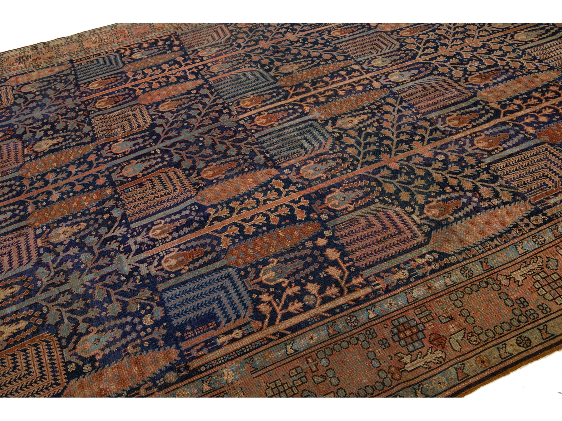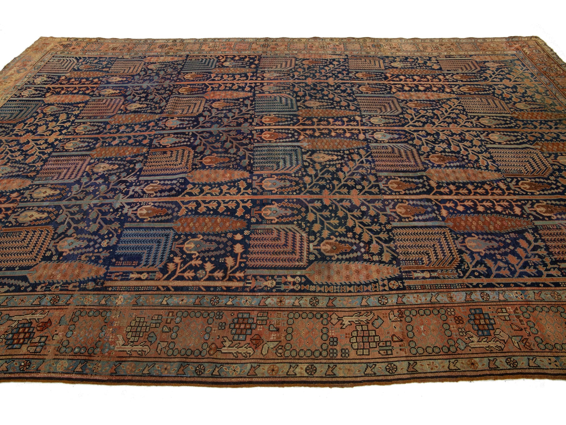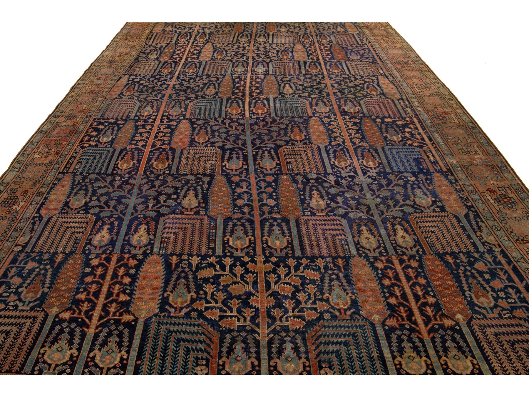 Discover the elegance of a hand-knotted antique Bakshaish rug, featuring vibrant rust accents on a luxurious navy blue background. These rugs are unique treasures for connoisseurs, showcasing distinctive patterns, movement, and asymmetry. The masterful use of natural dyes gives them rich colors, elevating them to one-of-a-kind art objects. This rug measures 9'5" x 13'10".
