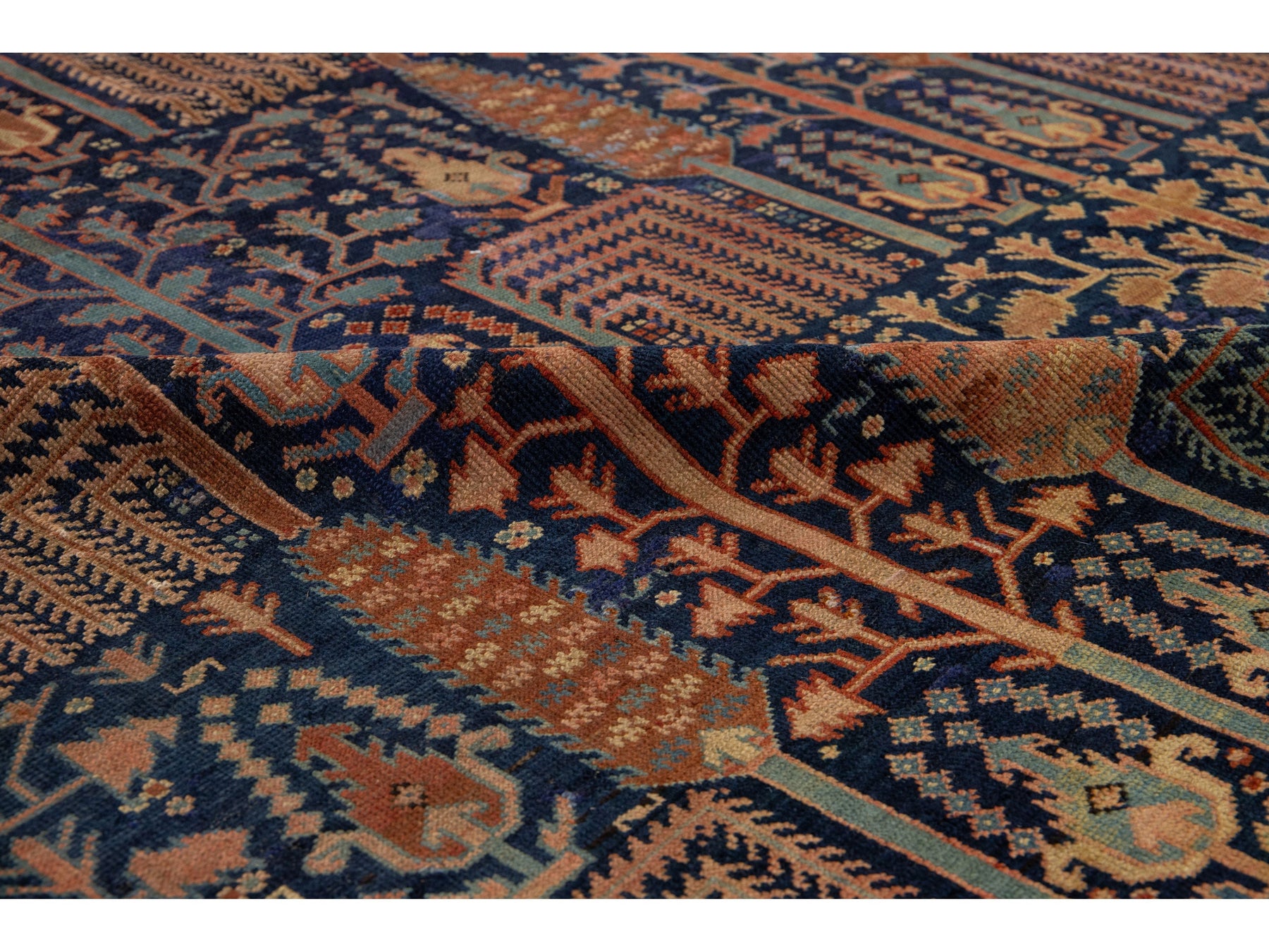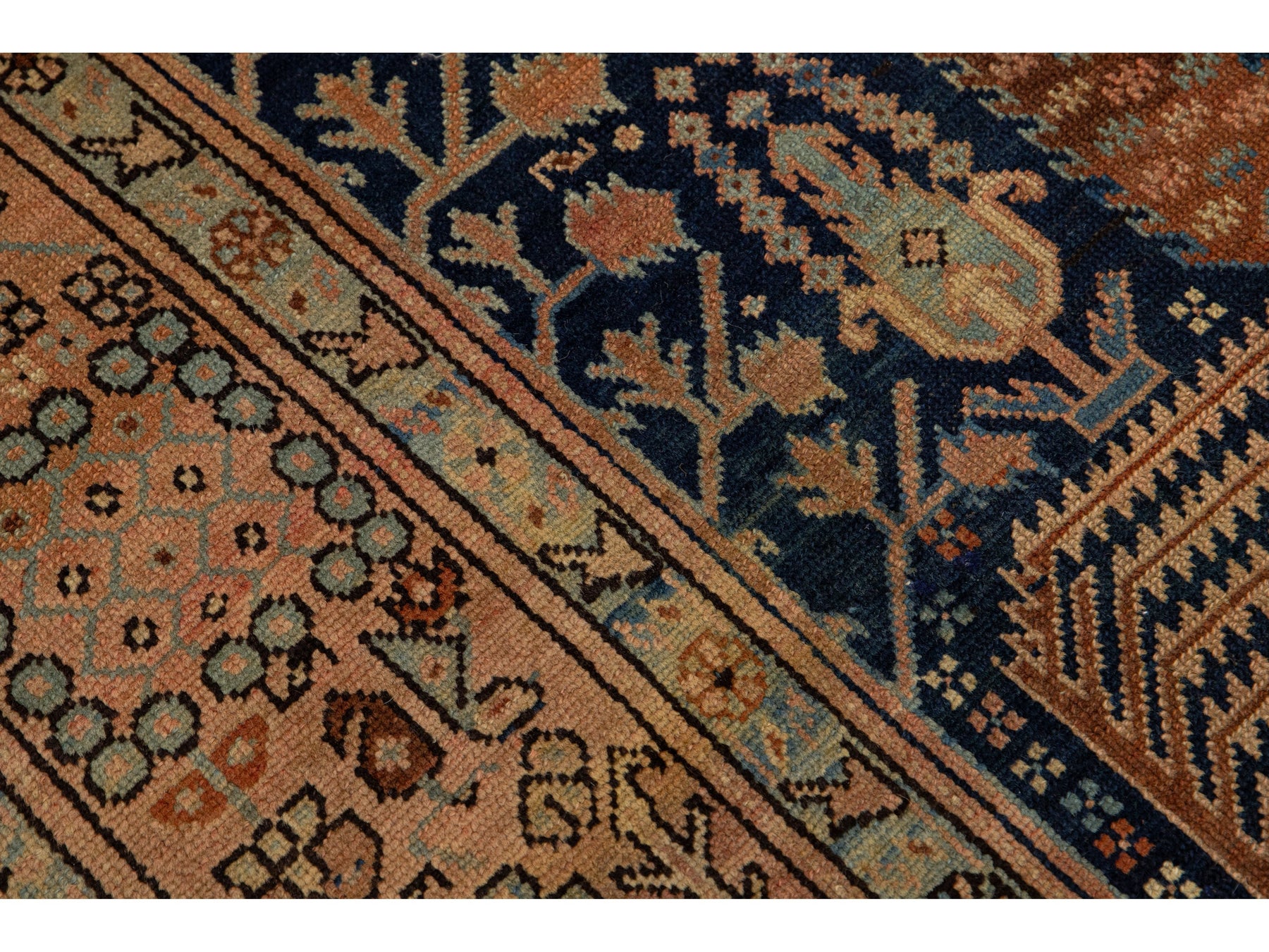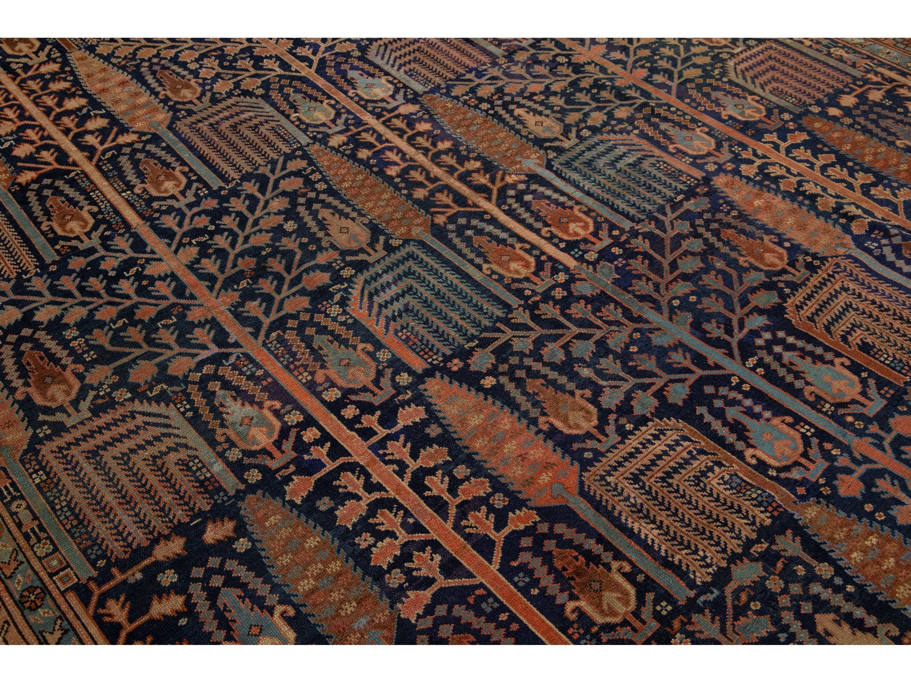 Discover the elegance of a hand-knotted antique Bakshaish rug, featuring vibrant rust accents on a luxurious navy blue background. These rugs are unique treasures for connoisseurs, showcasing distinctive patterns, movement, and asymmetry. The masterful use of natural dyes gives them rich colors, elevating them to one-of-a-kind art objects. This rug measures 9'5" x 13'10".