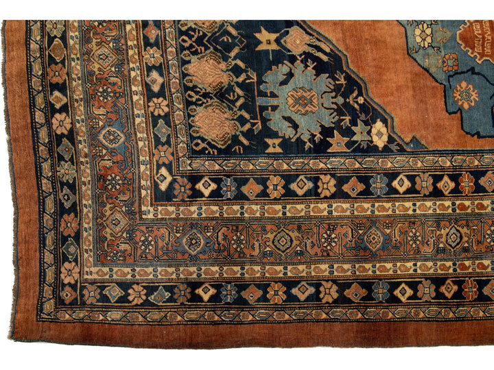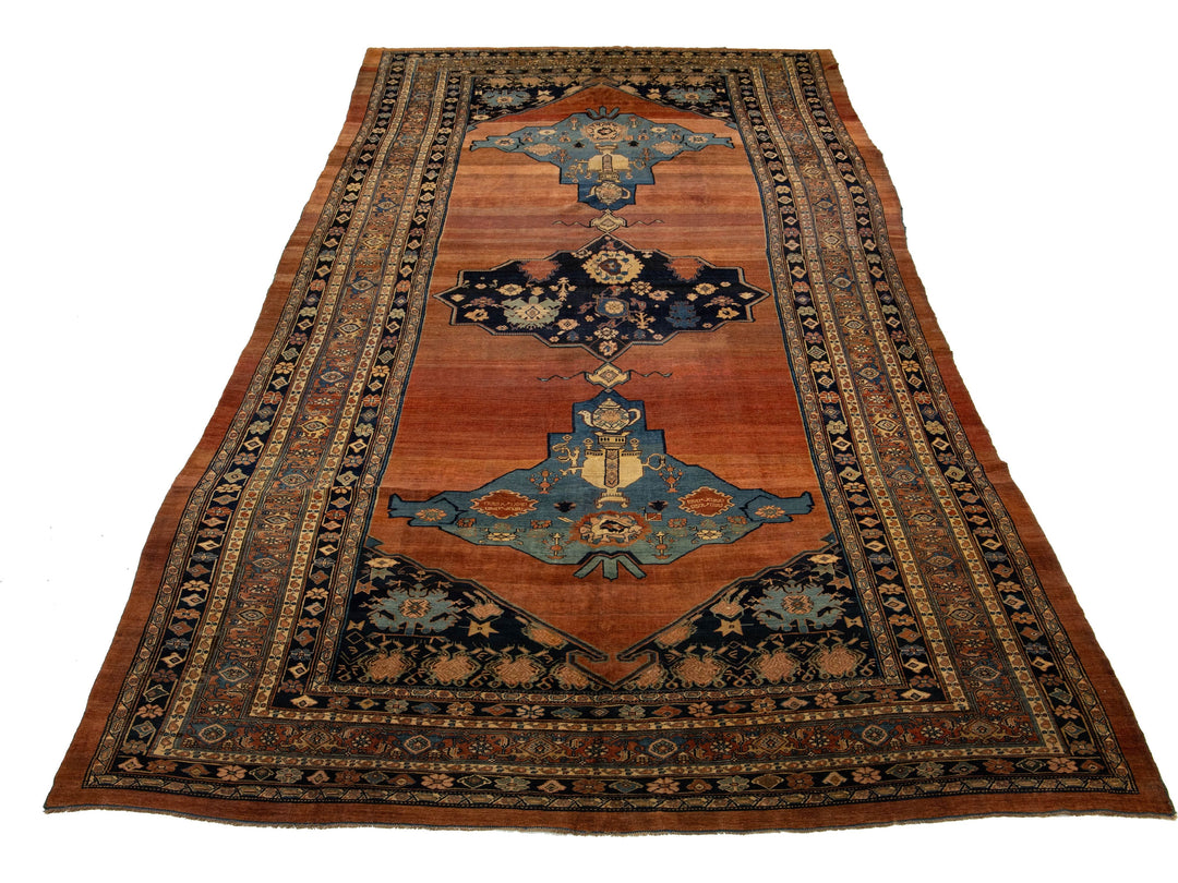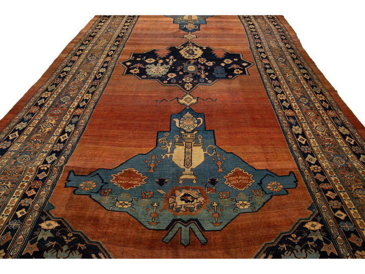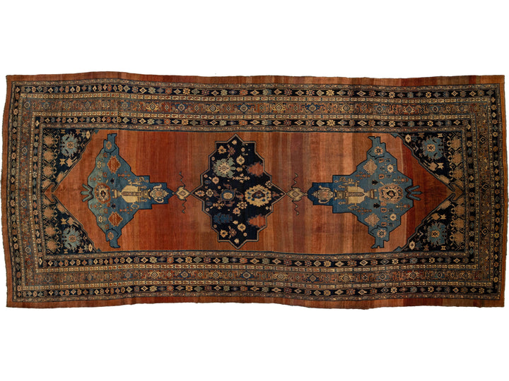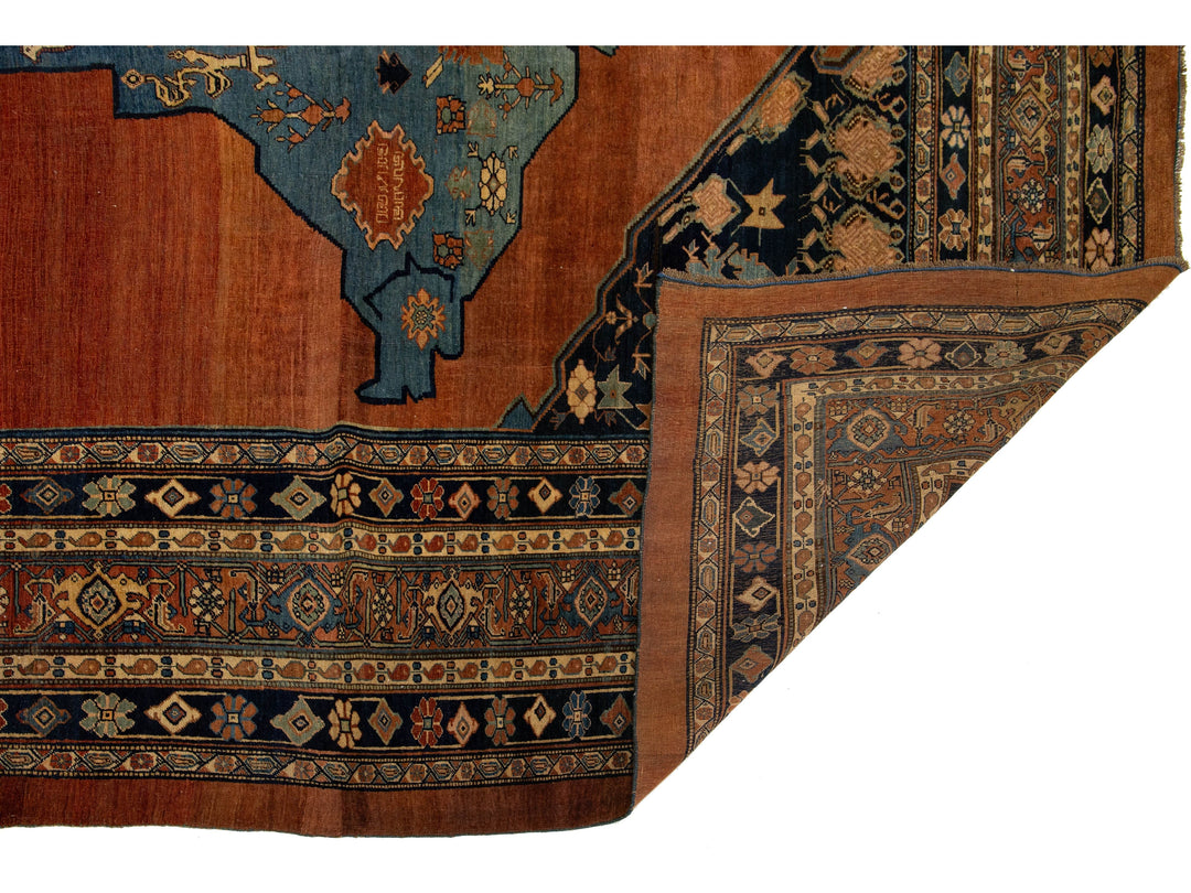 This antique Persian Bidjar wool rug is a captivating statement piece with charm and character. Meticulously crafted from high-quality hand-knotted wool, it features a stunning rust and deep blue color palette that elegantly highlights a floral pattern, enriched by multicolored accents. This rug measures 9'9" x 21'6".