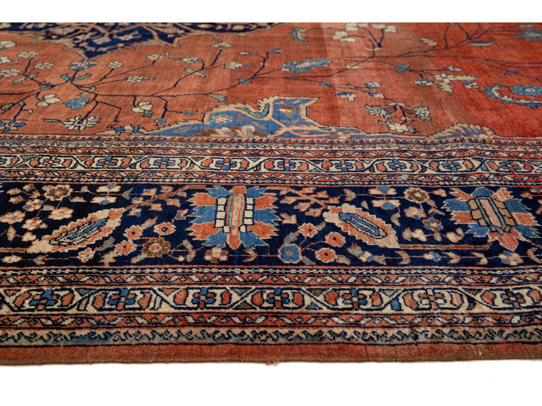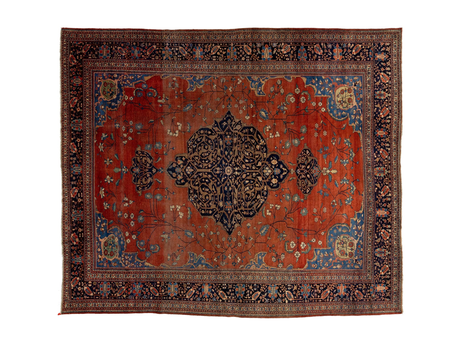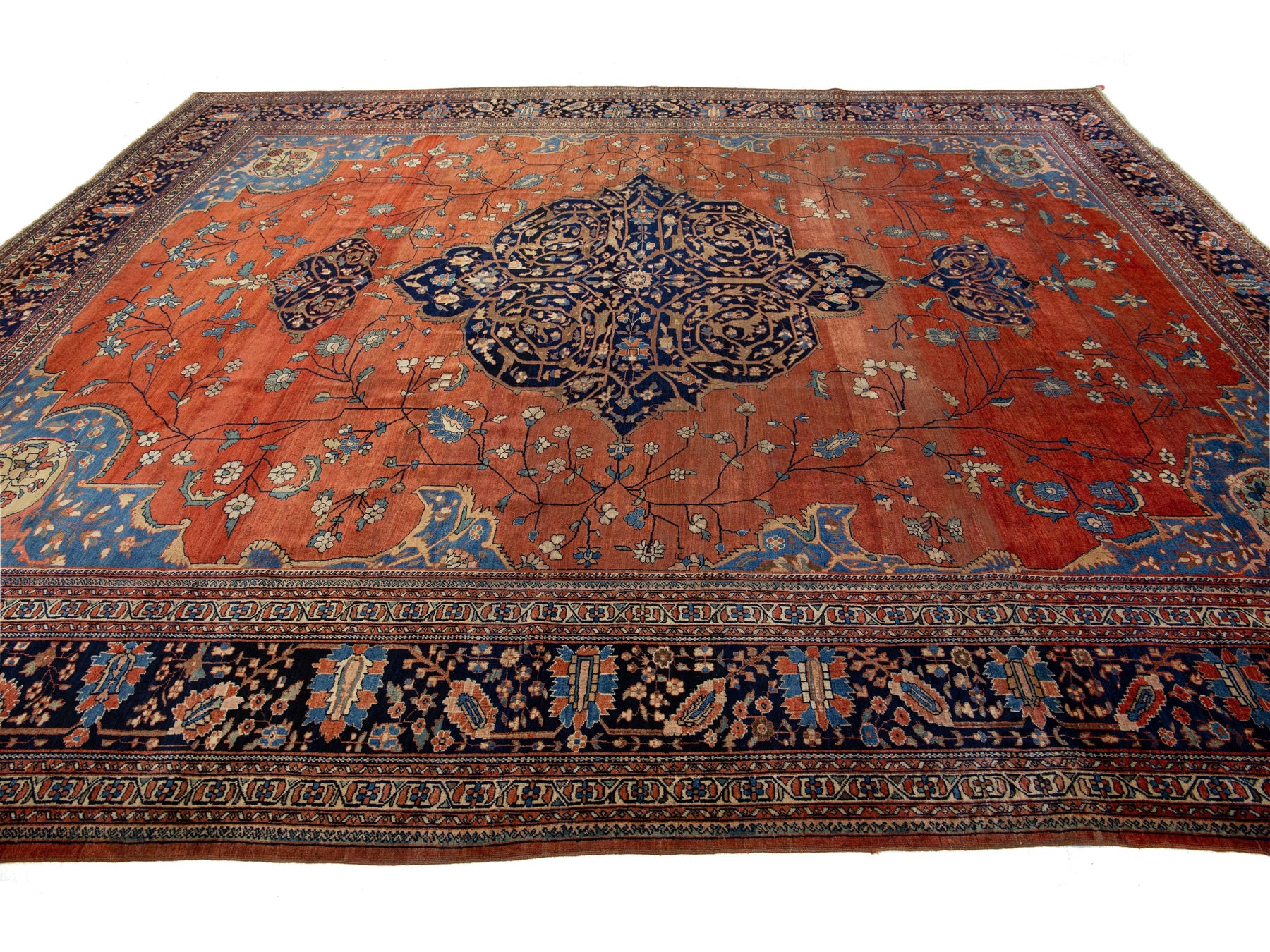 This beautiful antique Persian Farahan hand-knotted wool rug dates back to the 1880s. Its red-rust field features classic deep blue accents in a floral medallion design. This rug measures 11'1" x 13'1".