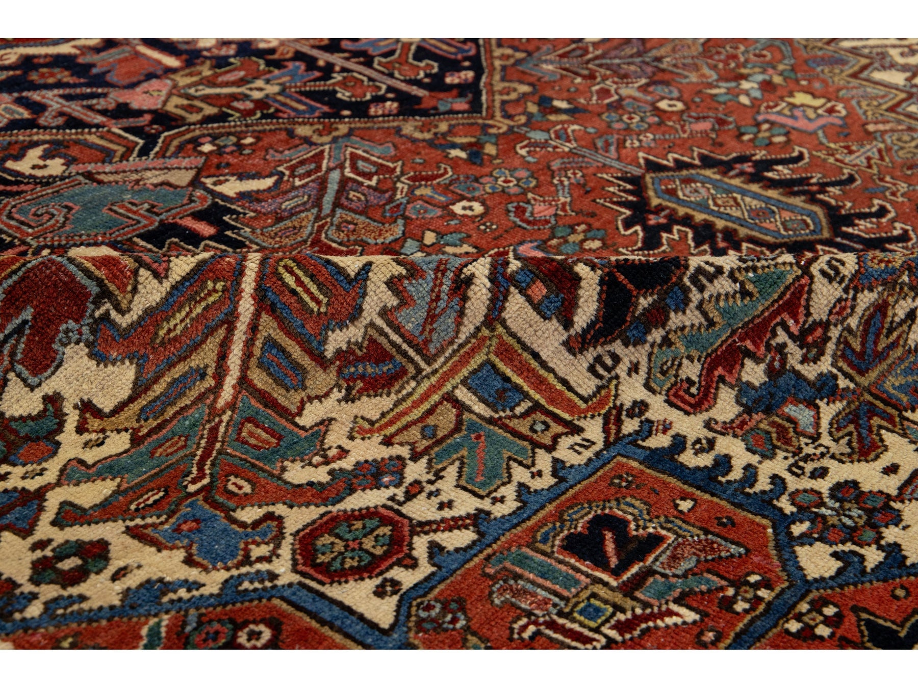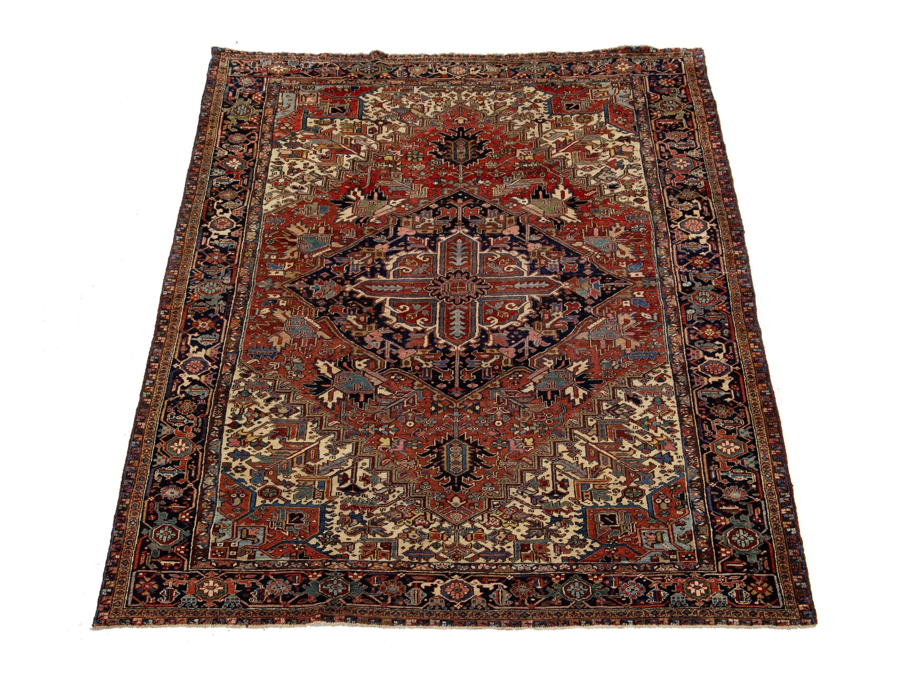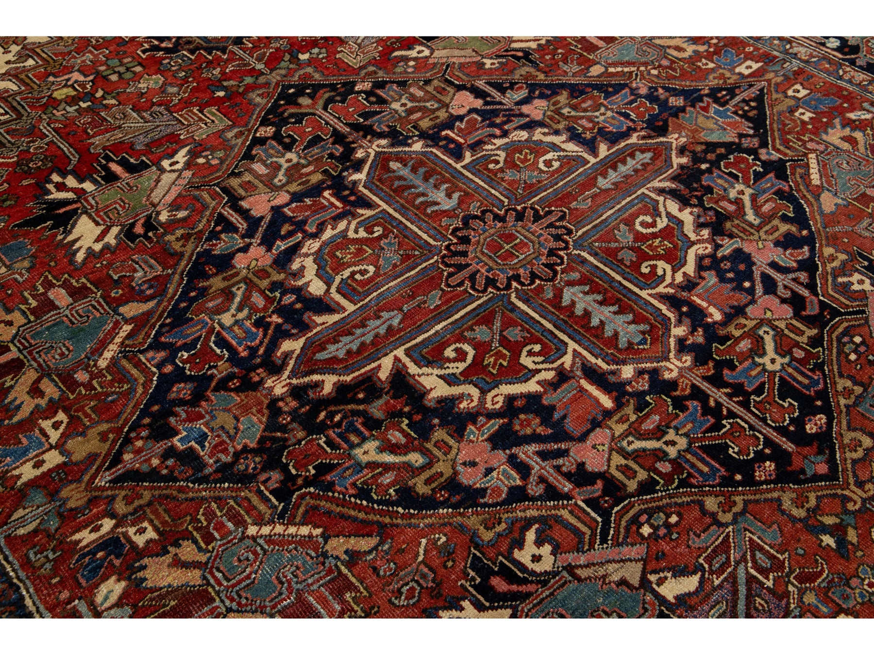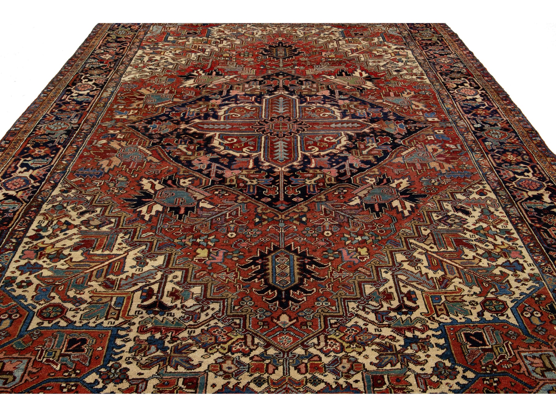 Discover the beauty of this antique Persian Heriz wool rug, showcasing a stunning medallion pattern that brings life to a luxurious deep red background. This rug measures 9'3'' x 12'.