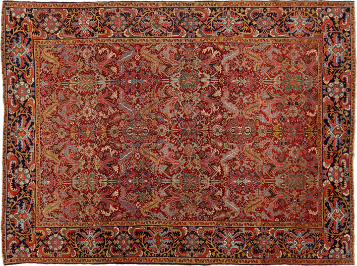An antique Persian Heriz wool rug featuring a vibrant multicolor allover pattern on a deep red background. This rug measures 9'5'' x 12'6''.