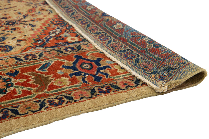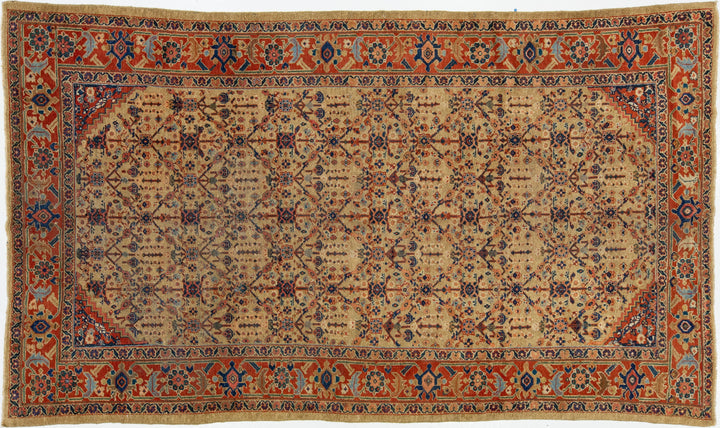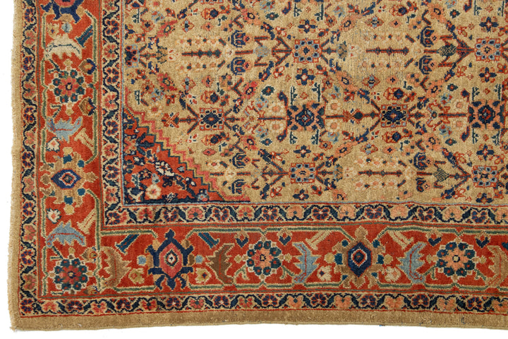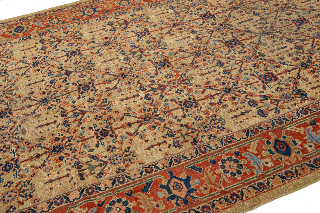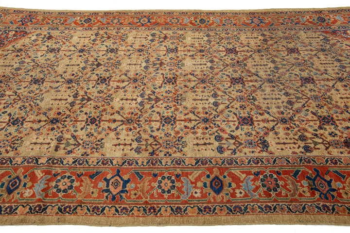 A hand-knotted wool antique Mahal rug features an all-over design with blue and rust accents on a tan background. This rug measures 6'6" x 11'.