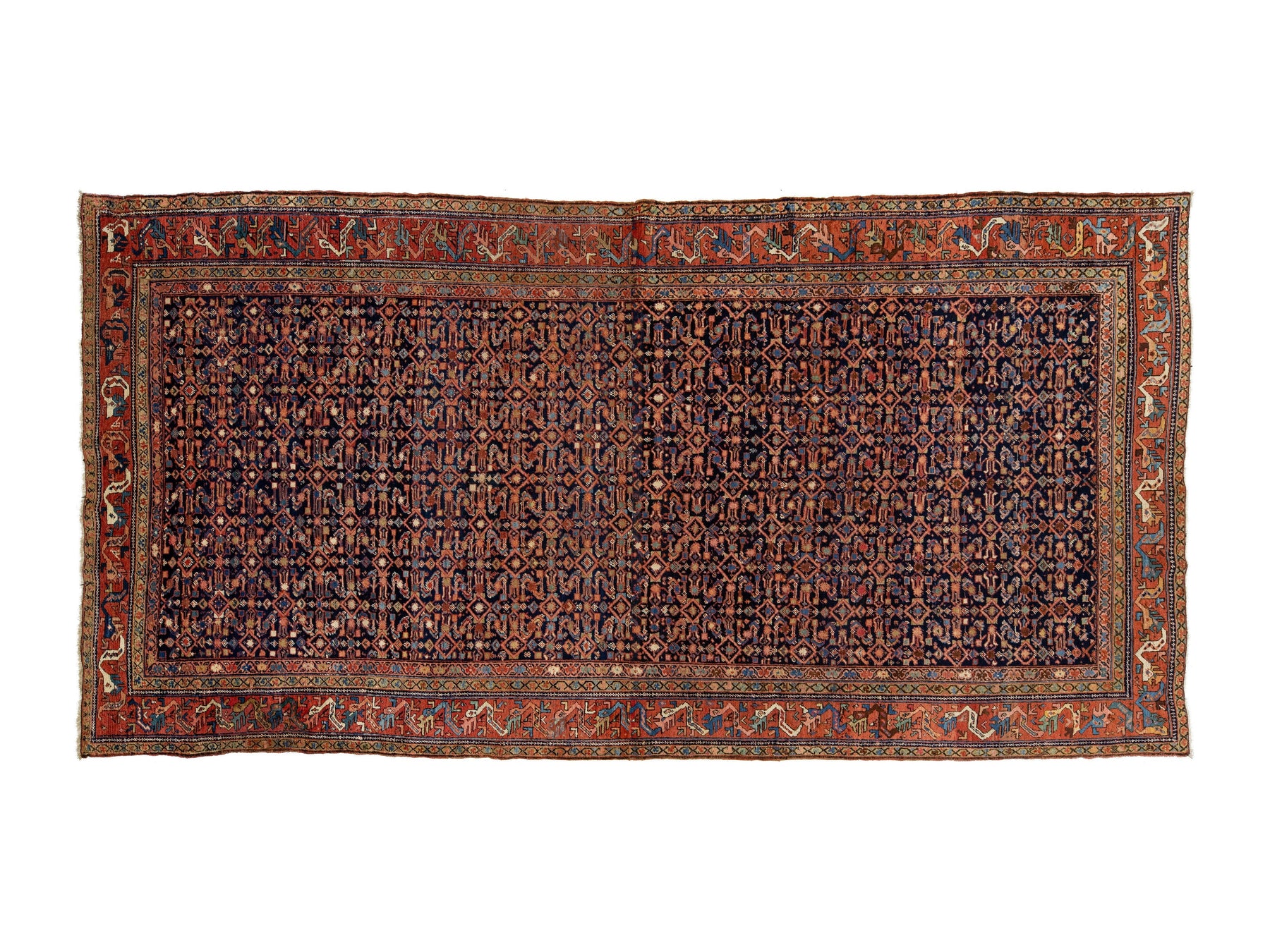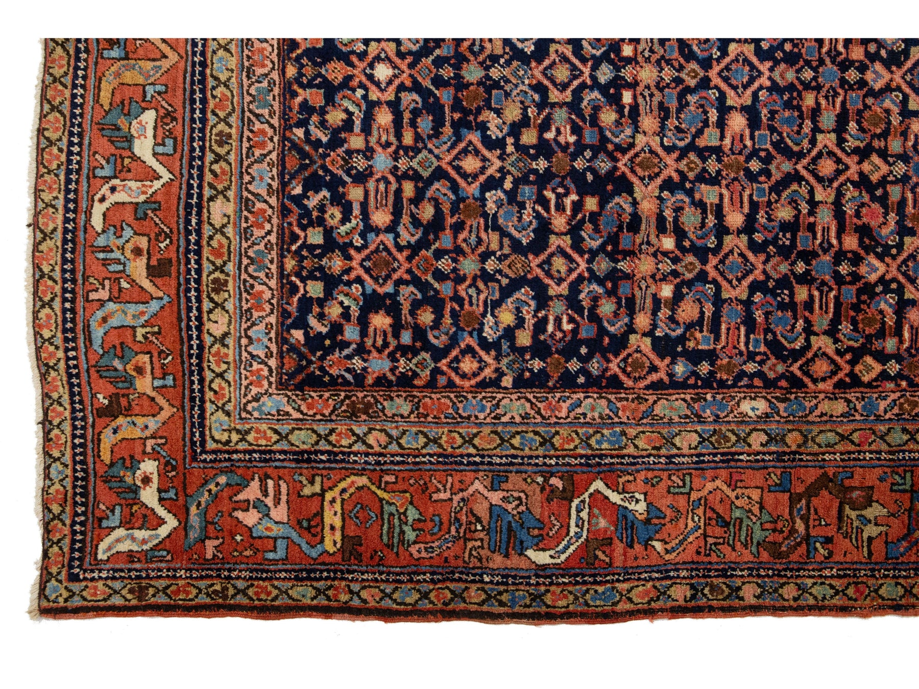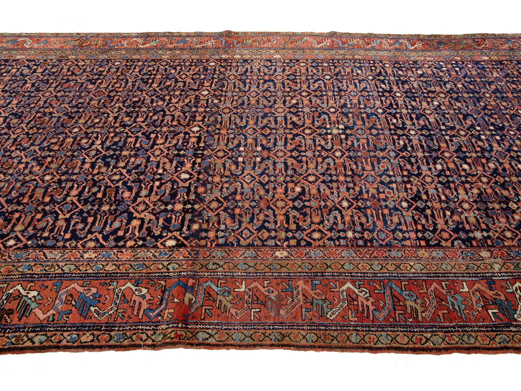 This is a handmade Persian Malayer rug from the 20th century. It features a navy blue field with multicolor accents throughout the all over geometric pattern. This rug measures 7'4" X 14'3".