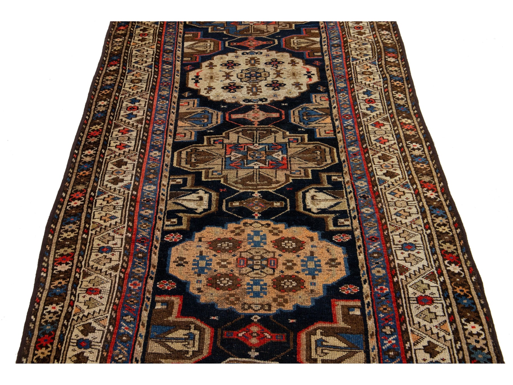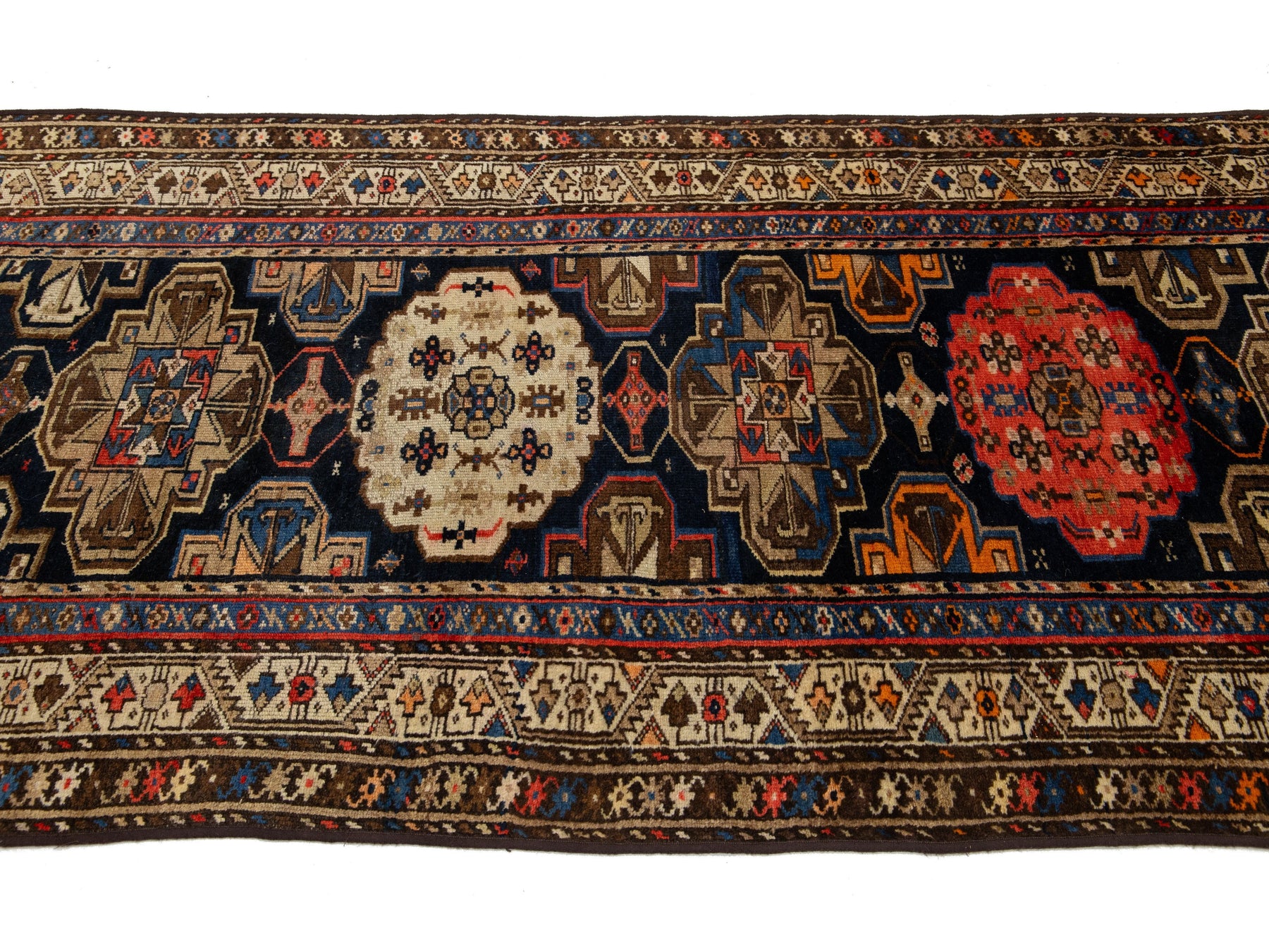 This 20th-century handmade Persian Malayer rug features a navy blue field with red, yellow, and green accents throughout the design. This rug measures 3'10" X 10'2".