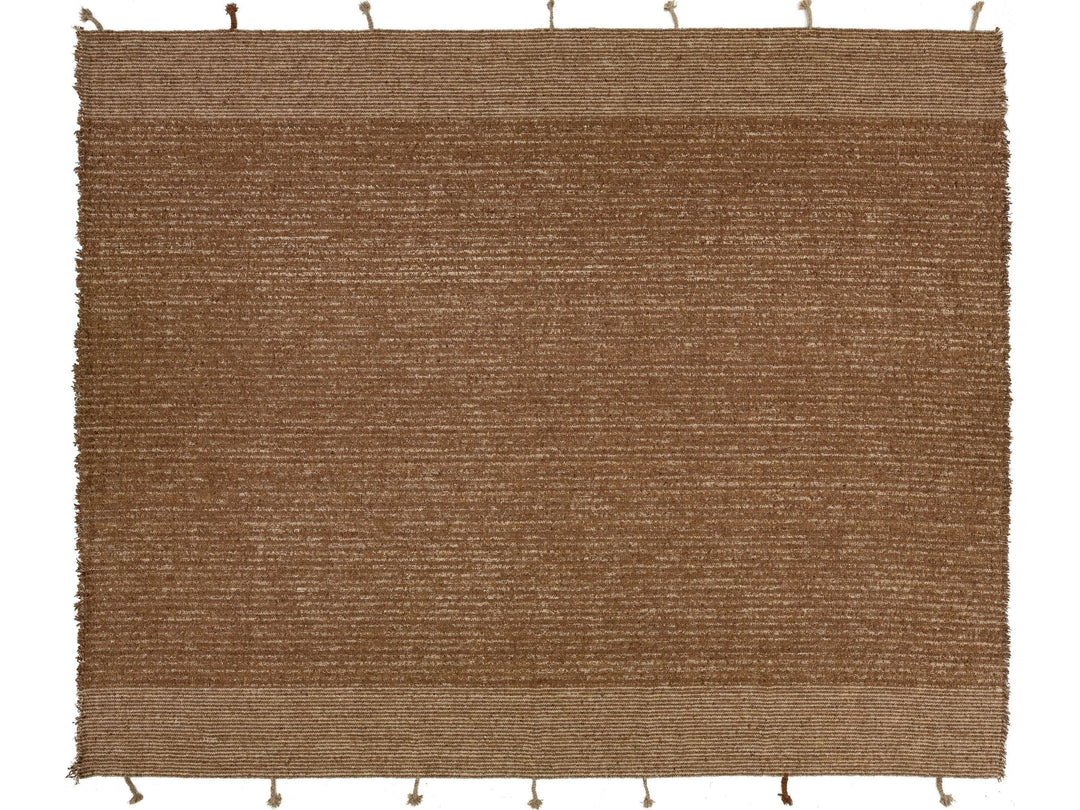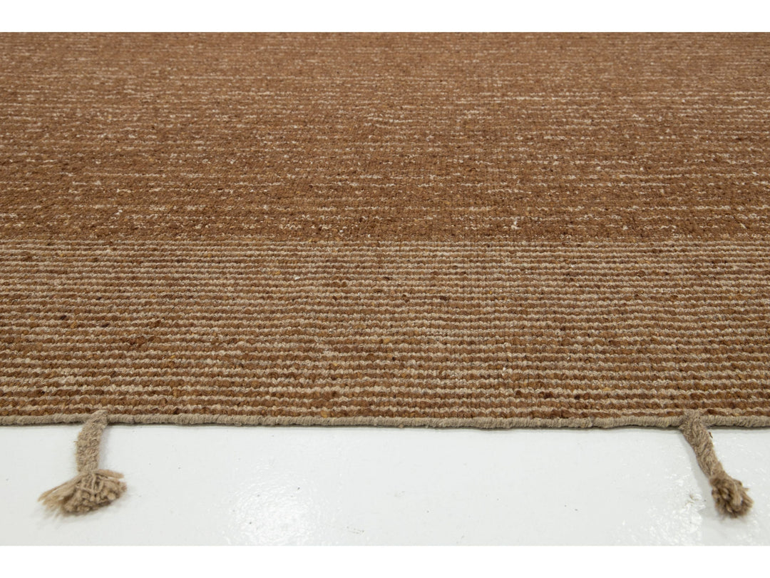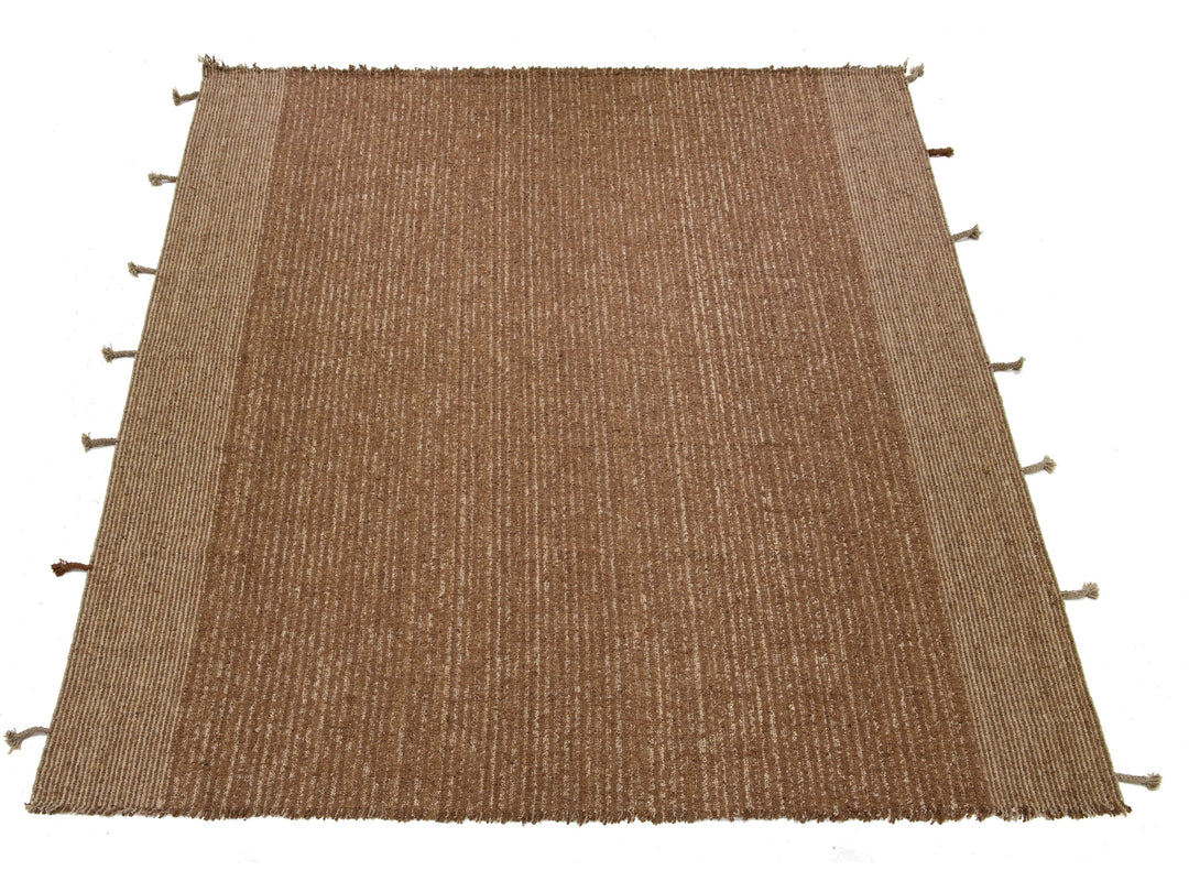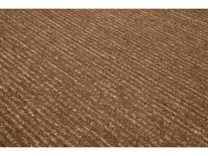 A contemporary flatweave kilim rug features a brown color field with an all-over striped design and fringes. This rug measures 12'1" x 14'10".