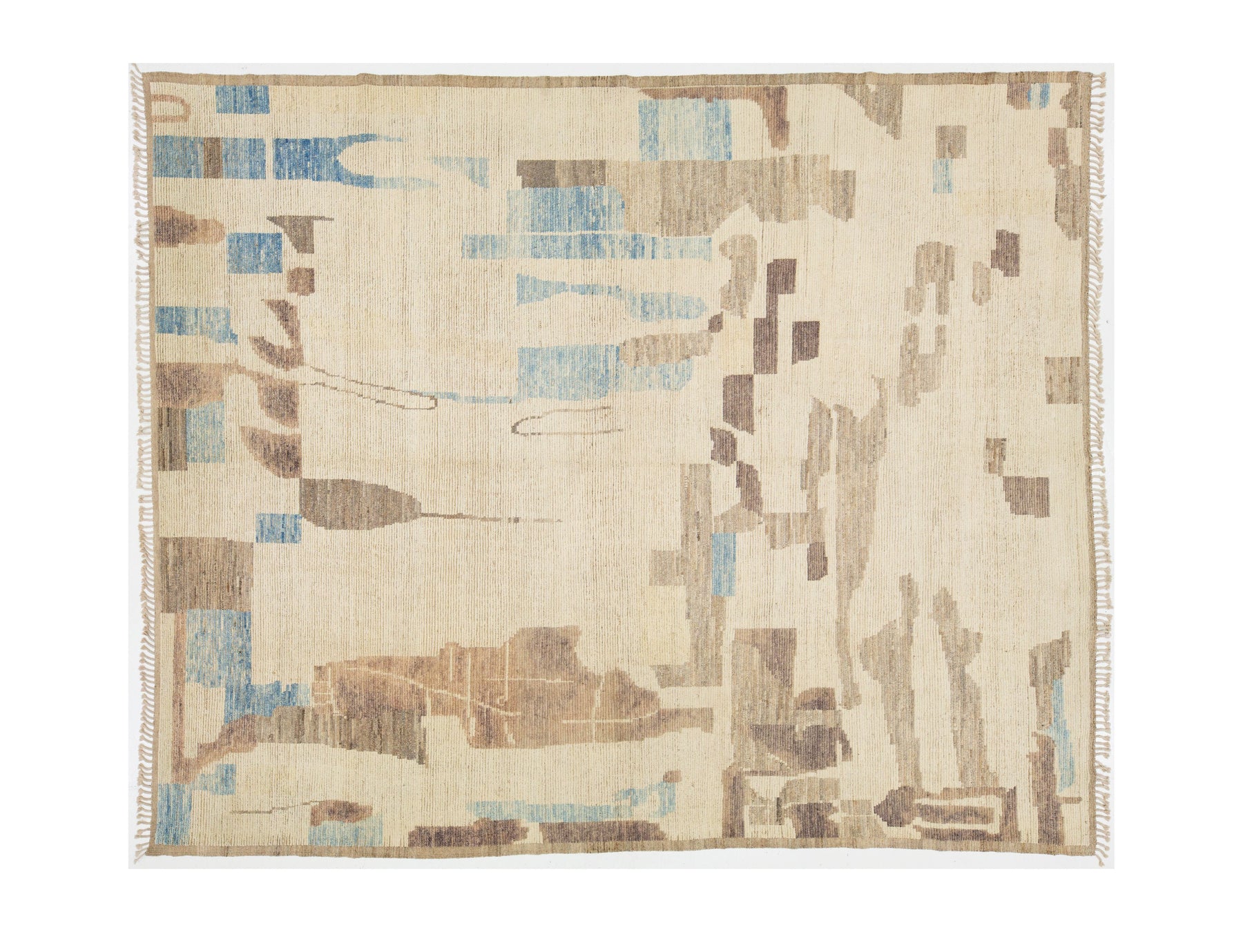 This handwoven Moroccan-style wool rug showcases a bold, abstract design in natural hues of beige, brown, and blue. Its organic forms and earthy palette evoke desert landscapes and artisanal heritage, making it a striking centerpiece for modern, boho, or eclectic interiors. This rug measures 12'0' X 14'7".