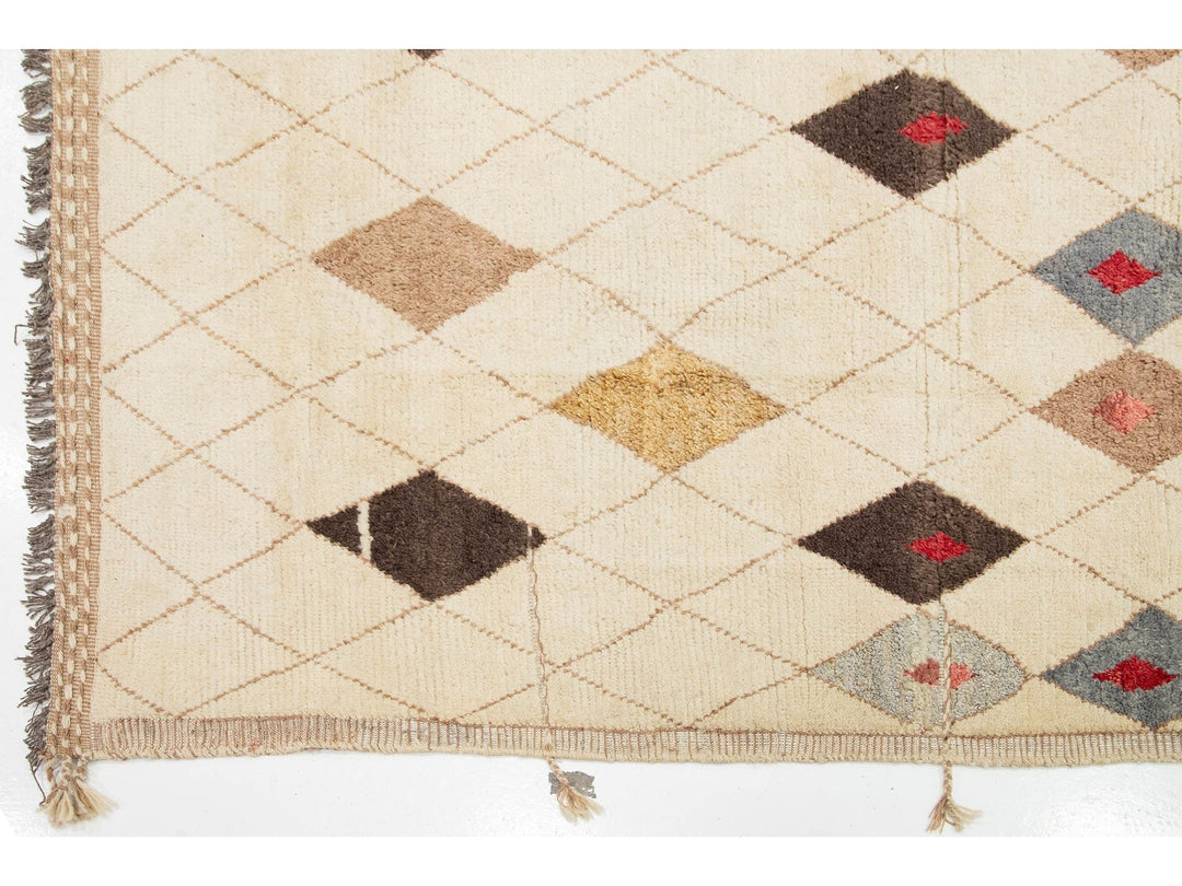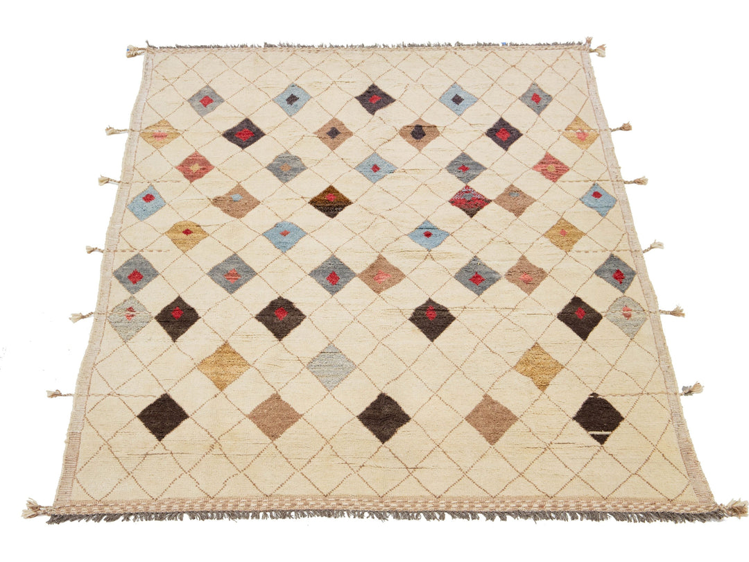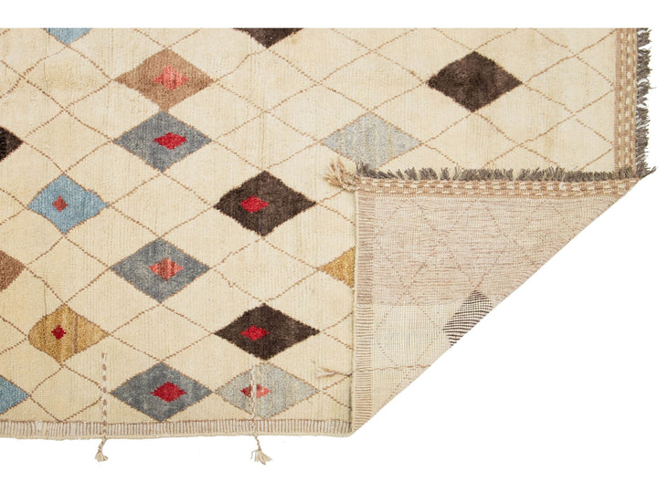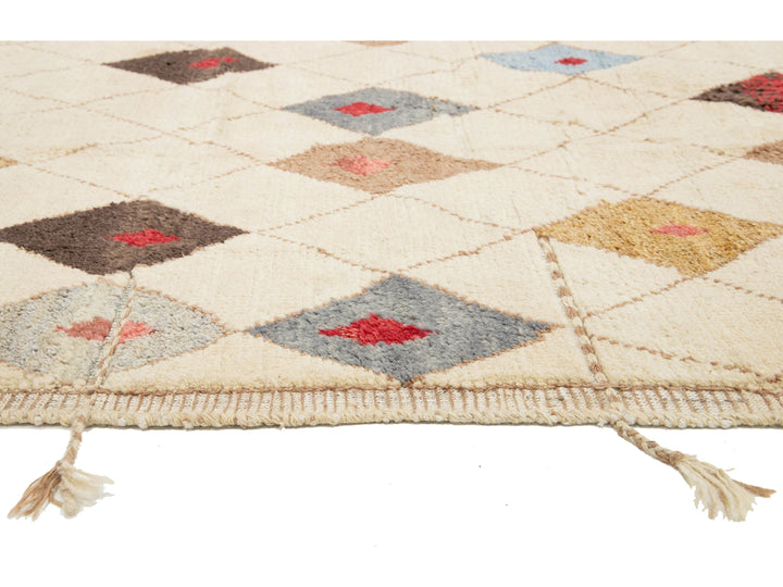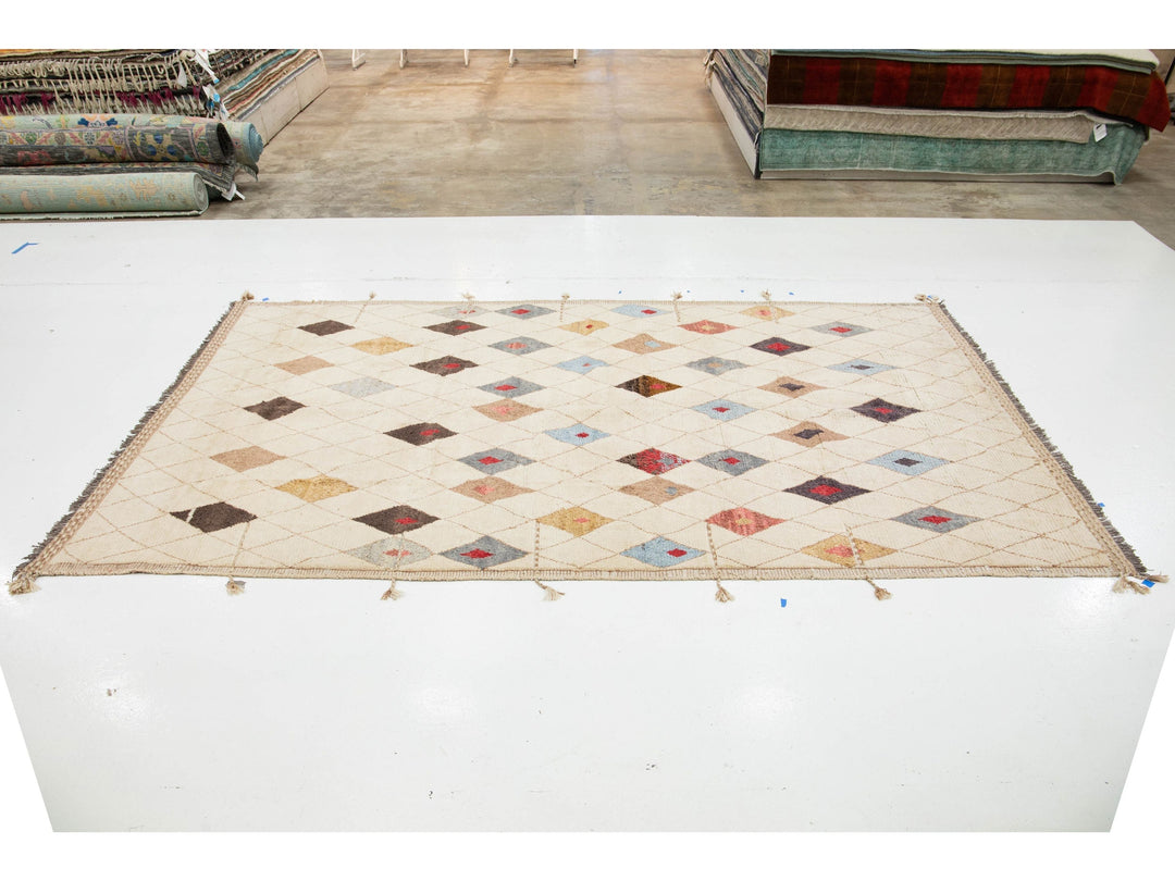 This handcrafted, contemporary Moroccan-style wool rug features a stunning beige background that seamlessly blends traditional craftsmanship with modern design elements in vibrant, multicolored hues. The intricately woven tribal patterns add depth and character to its soft texture, making it a perfect addition to any space. The rug measures 8'8" x 12'8".