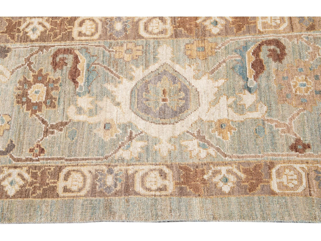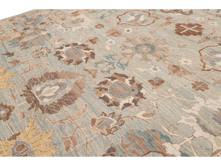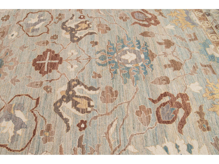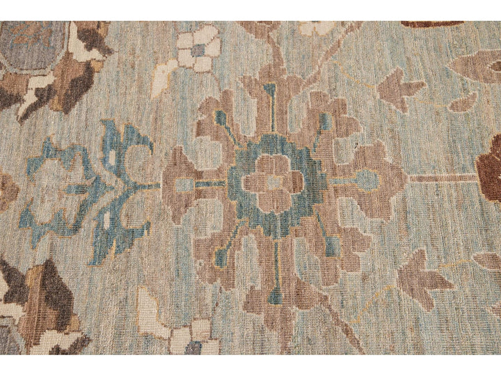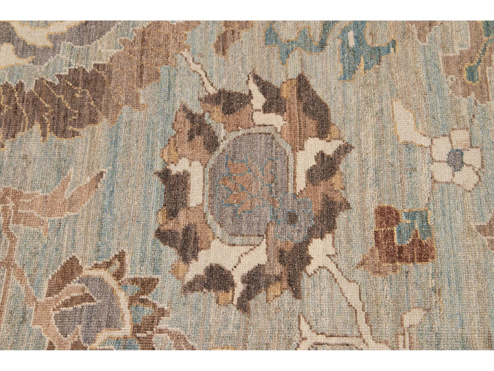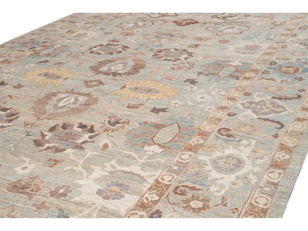 Beautiful Contemporary Indian Sultanabad Oversize Rug, hand-knotted wool with a light gray blue field, tan and brown accents in an allover floral design.